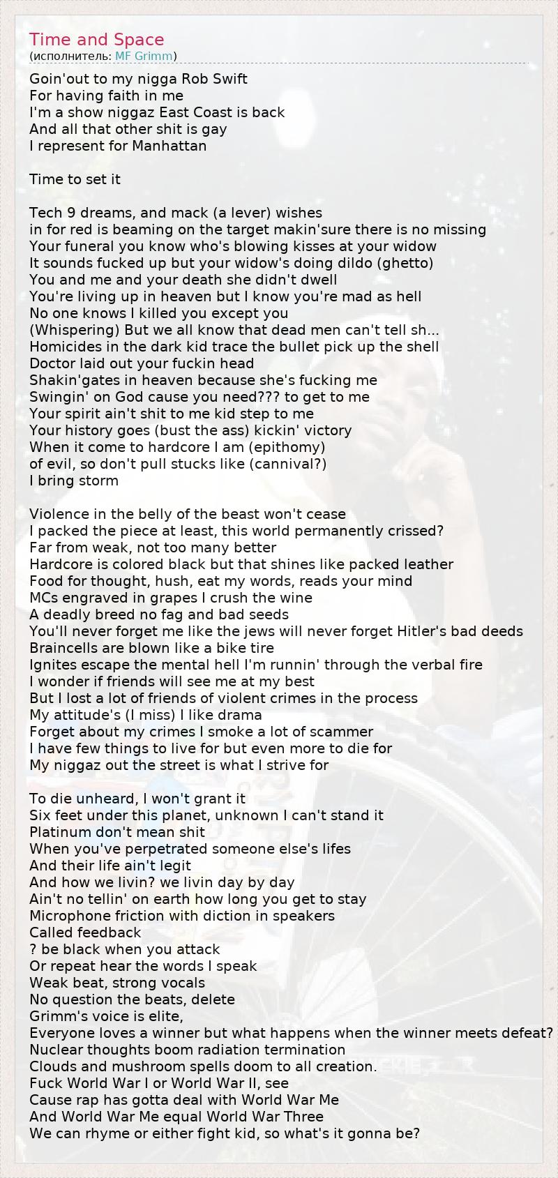 Goin'out to my nigga Rob Swift For having faith in me I'm a show niggaz East Coast is back And all that other shit is gay I represent for Manhattan Time to set it Tech 9 dreams, and mack (a lever) wishes in for red is beaming on the target makin'sure there is no missing Your funeral you know who's blowing kisses at your widow It sounds fucked up but your widow's doing dildo (ghetto) You and me and your death she didn't dwell You're living up in heaven but I know you're mad as hell No one knows I killed you except you (Whispering) But we all know that dead men can't tell sh... Homicides in the dark kid trace the bullet pick up the shell Doctor laid out your fuckin head Shakin'gates in heaven because she's fucking me Swingin' on God cause you need??? to get to me Your spirit ain't shit to me kid step to me Your history goes (bust the ass) kickin' victory When it come to hardcore I am (epithomy) of evil, so don't pull stucks like (cannival?) I bring storm Violence in the belly of the beast won't cease I packed the piece at least, this world permanently crissed? Far from weak, not too many better Hardcore is colored black but that shines like packed leather Food for thought, hush, eat my words, reads your mind MCs engraved in grapes I crush the wine A deadly breed no fag and bad seeds You'll never forget me like the jews will never forget Hitler's bad deeds Braincells are blown like a bike tire Ignites escape the mental hell I'm runnin' through the verbal fire I wonder if friends will see me at my best But I lost a lot of friends of violent crimes in the process My attitude's (I miss) I like drama Forget about my crimes I smoke a lot of scammer I have few things to live for but even more to die for My niggaz out the street is what I strive for To die unheard, I won't grant it Six feet under this planet, unknown I can't stand it Platinum don't mean shit When you've perpetrated someone else's lifes And their life ain't legit And how we livin? we livin day by day Ain't no tellin' on earth how long you get to stay Microphone friction with diction in speakers Called feedback ? be black when you attack Or repeat hear the words I speak Weak beat, strong vocals No question the beats, delete Grimm's voice is elite, Everyone loves a winner but what happens when the winner meets defeat? Nuclear thoughts boom radiation termination Clouds and mushroom spells doom to all creation. Fuck World War I or World War II, see Cause rap has gotta deal with World War Me And World War Me equal World War Three We can rhyme or either fight kid, so what's it gonna be?