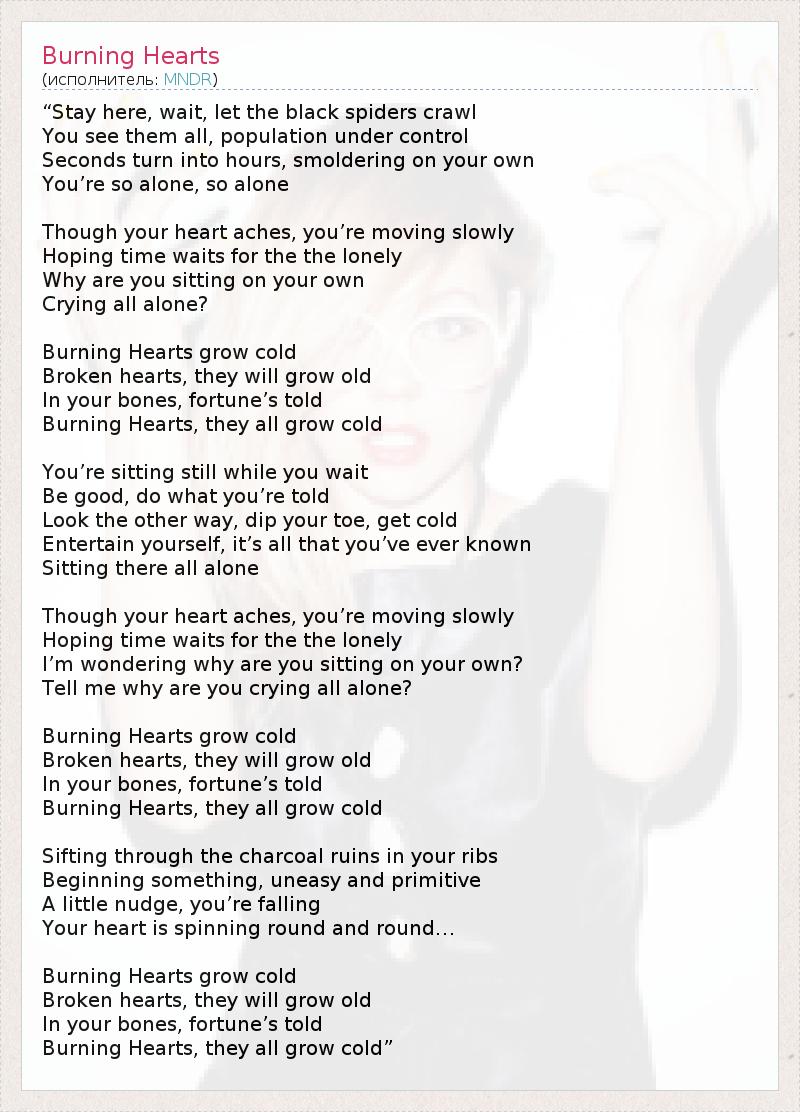 “Stay here, wait, let the black spiders crawl You see them all, population under control Seconds turn into hours, smoldering on your own You’re so alone, so alone Though your heart aches, you’re moving slowly Hoping time waits for the the lonely Why are you sitting on your own Crying all alone? Burning Hearts grow cold Broken hearts, they will grow old In your bones, fortune’s told Burning Hearts, they all grow cold You’re sitting still while you wait Be good, do what you’re told Look the other way, dip your toe, get cold Entertain yourself, it’s all that you’ve ever known Sitting there all alone Though your heart aches, you’re moving slowly Hoping time waits for the the lonely I’m wondering why are you sitting on your own? Tell me why are you crying all alone? Burning Hearts grow cold Broken hearts, they will grow old In your bones, fortune’s told Burning Hearts, they all grow cold Sifting through the charcoal ruins in your ribs Beginning something, uneasy and primitive A little nudge, you’re falling Your heart is spinning round and round… Burning Hearts grow cold Broken hearts, they will grow old In your bones, fortune’s told Burning Hearts, they all grow cold”