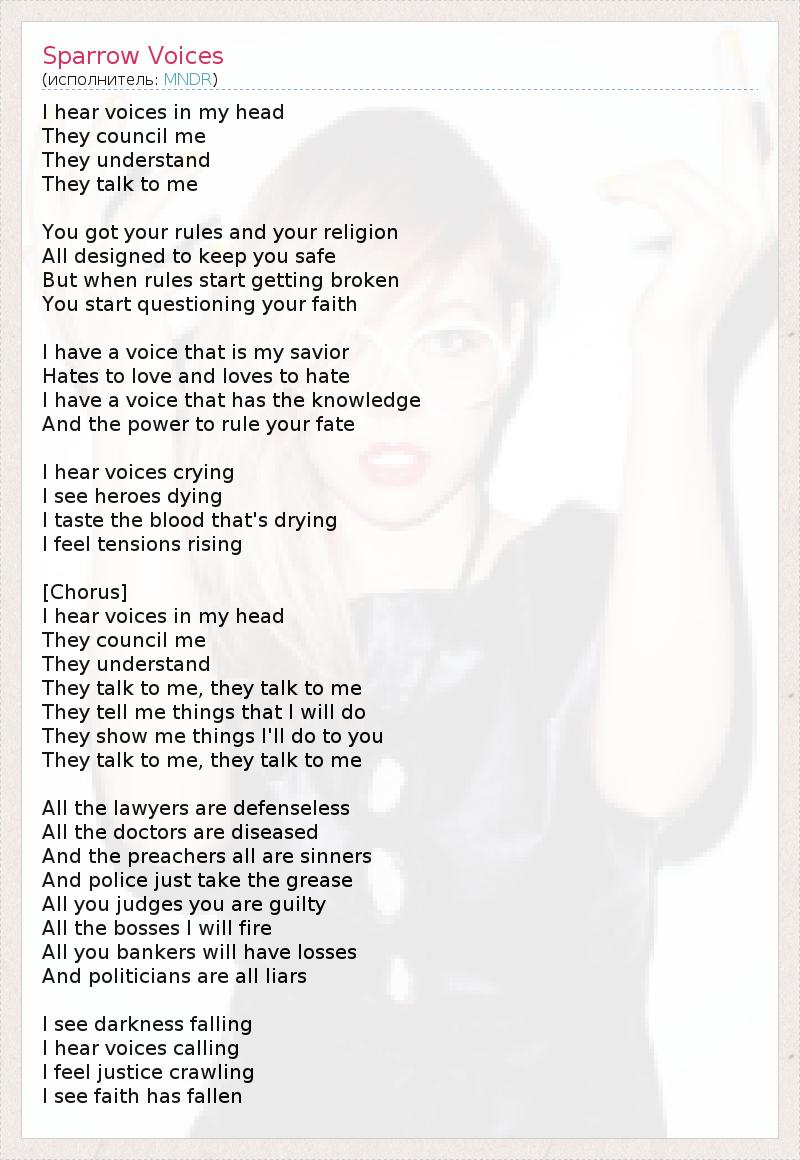 Я слышу голоса в моей голове Они дают советы мне, Они понимают меня, Они говорят со мной У вас есть свои правила, Созданные для того, что бы вы чувствовали себя в безопасности, Но когда эти правила нарушаются, Вы начинаете задумываться о своей вере в них, У меня есть голос, мой спаситель, Ненавидит любить, и любит ненавидеть, У меня есть голос, мудрый голос, Который может править вашей судьбой, Слышу – голоса кричат, Вижу – герои погибают, Вкушаю засыхающую кровь, Чувствую – напряжение увеличивается Я слышу голоса в моей голове Они дают советы мне, Они понимают меня, Они говорят со мной ( x2 ) Они говорят мне, что я должен делать, Они объясняют мне, что я должен тебе сделать, Они говорят со мной, говорят со мной! ( х3 ) Они говорят со мной, говорят со мной! ( х3 ) Адвокаты – беззащитны, Доктора – больны, Священники – грешники, Полицейские – куплены, Все судьи виновны, Боссов всех уволю я, Все банкиры обанкротятся, А политики – вруны! Вижу – наступает тьма, Слышу – голоса зовут, Чувствую – справедливость отсутствует, Вижу – веры больше нет, Я слышу голоса в моей голове Они дают советы мне, Они понимают меня, Они говорят со мной ( x2 ) Они говорят мне, что я должен делать, Они объясняют мне, что я должен сделать тебе, Они говорят со мной, говорят со мной! Они говорят со мной, говорят со мной! ( х3 ) Слышу – голоса кричат, Вижу – герои погибают, Вкушаю засыхающую кровь, Чувствую – напряжение увеличивается Я слышу голоса в моей голове Они дают советы мне, Они понимают меня, Они говорят со мной ( x2 ) Они говорят мне, что я должен делать, Они объясняют мне, что я должен сделать тебе, Они говорят со мной, говорят со мной! ( х3 )