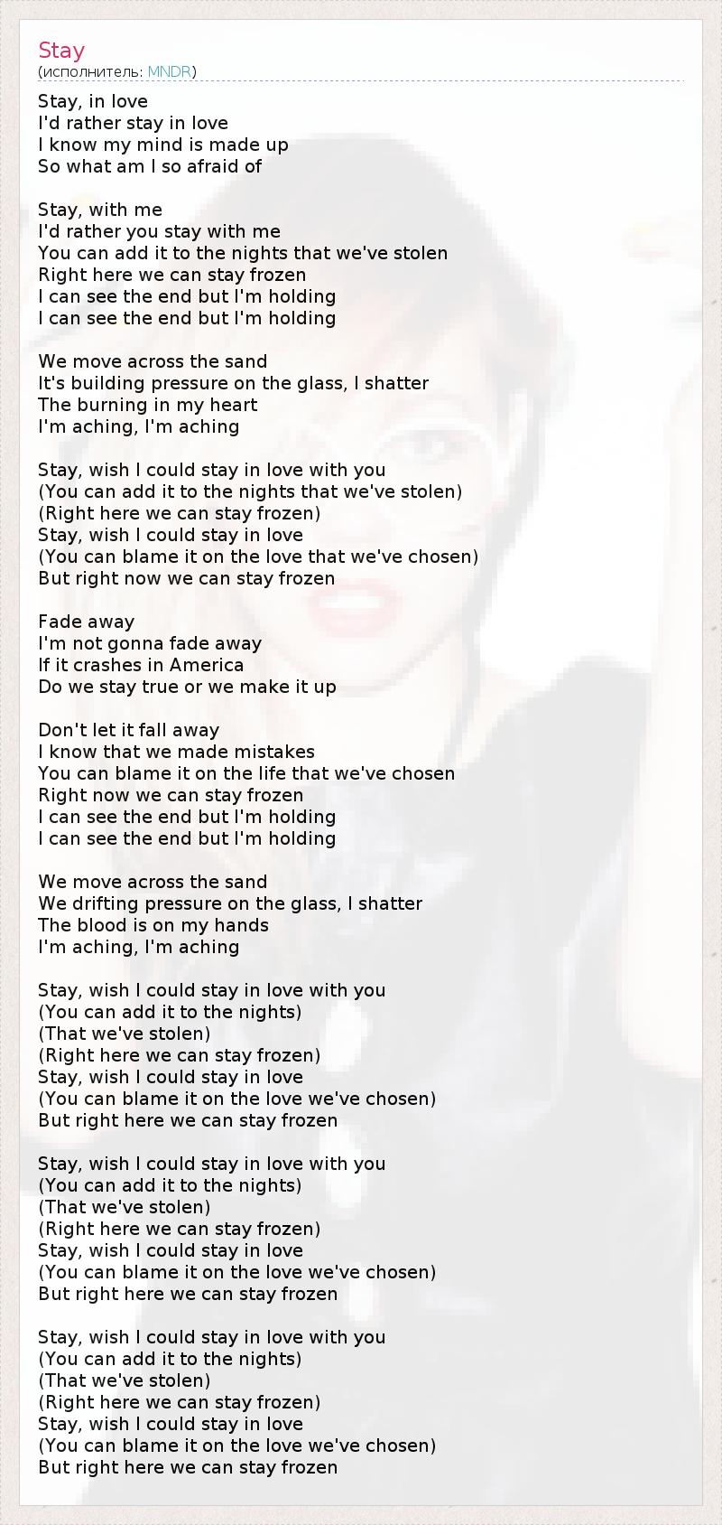 Stay, in love I'd rather stay in love I know my mind is made up So what am I so afraid of Stay, with me I'd rather you stay with me You can add it to the nights that we've stolen Right here we can stay frozen I can see the end but I'm holding I can see the end but I'm holding We move across the sand It's building pressure on the glass, I shatter The burning in my heart I'm aching, I'm aching Stay, wish I could stay in love with you (You can add it to the nights that we've stolen) (Right here we can stay frozen) Stay, wish I could stay in love (You can blame it on the love that we've chosen) But right now we can stay frozen Fade away I'm not gonna fade away If it crashes in America Do we stay true or we make it up Don't let it fall away I know that we made mistakes You can blame it on the life that we've chosen Right now we can stay frozen I can see the end but I'm holding I can see the end but I'm holding We move across the sand We drifting pressure on the glass, I shatter The blood is on my hands I'm aching, I'm aching Stay, wish I could stay in love with you (You can add it to the nights) (That we've stolen) (Right here we can stay frozen) Stay, wish I could stay in love (You can blame it on the love we've chosen) But right here we can stay frozen Stay, wish I could stay in love with you (You can add it to the nights) (That we've stolen) (Right here we can stay frozen) Stay, wish I could stay in love (You can blame it on the love we've chosen) But right here we can stay frozen Stay, wish I could stay in love with you (You can add it to the nights) (That we've stolen) (Right here we can stay frozen) Stay, wish I could stay in love (You can blame it on the love we've chosen) But right here we can stay frozen