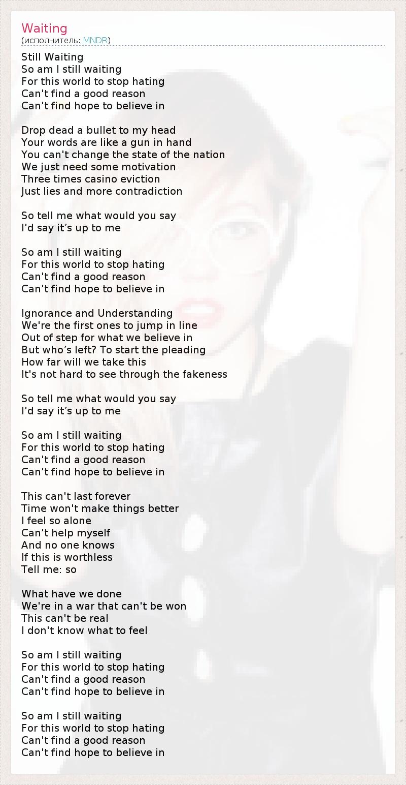 Всё ещё жду, Жду ли я всё ещё, Пока этот мир не перестанет ненавидеть? Я не могу найти хорошей причины, Не могу найти надежды и веры. Падаю навзничь – в моей голове пуля, Твои слова, как ружьё на прицеле. Нельзя изменить состояние нации, Нам просто нужно немного мотивации, Редкие визиты казино, Ложь и больше противоречий. Поэтому скажи, что бы ты сказала? Я бы сказал, что решать придётся мне. Поэтому жду ли я всё ещё, Пока этот мир не перестанет ненавидеть? Я не могу найти хорошей причины, Не могу найти надежды и веры. Незнание и Понимание, Мы первыми должны выделиться в этом строю, Чтобы показать, во что мы верим. Но кто остался, чтобы начать прошение? Как далеко мы зайдём? Нетрудно разглядеть фальшь. Поэтому скажи, что бы ты сказала? Я бы сказал, что решать придётся мне. Поэтому жду ли я всё ещё, Пока этот мир не перестанет ненавидеть? Я не могу найти хорошей причины, Не могу найти надежды и веры. Это не может длиться вечно. Со временем мало что меняется в лучшую сторону. Я чувствую себя таким одиноким И ничего не могу с этим поделать. Никто не знает, Стоит ли это чего-нибудь. Скажи мне об этом. Что мы наделали, Мы завязли в войне, в которой не может быть победителей. Это не может быть правдой. Я не знаю, что мне чувствовать. Поэтому жду ли я всё ещё, Пока этот мир не перестанет ненавидеть? Я не могу найти хорошей причины, Не могу найти надежды и веры. Поэтому жду ли я всё ещё, Пока этот мир не перестанет ненавидеть? Я не могу найти хорошей причины, Не могу найти надежды и веры.