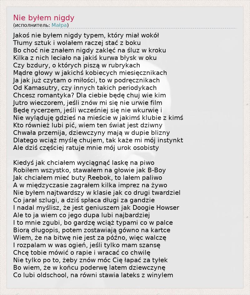 Jakoś nie byłem nigdy typem, który miał wokół Tłumy sztuk i wolałem raczej stać z boku Bo choć nie znałem nigdy zaklęć na śluz w kroku Kilka z nich leciało na jakiś kurwa błysk w oku Czy bzdury, o których piszą w rubrykach Mądre głowy w jakichś kobiecych miesięcznikach Ja jak już czytam o miłości, to w podręcznikach Od Kamasutry, czy innych takich periodykach Chcesz romantyka? Dla ciebie będę chuj wie kim Jutro wieczorem, jeśli znów mi się nie urwie film Będę rycerzem, jeśli wcześniej się nie wkurwię i Nie wyląduję gdzieś na mieście w jakimś klubie z kimś Kto również lubi pić, wiem ten świat jest dziwny Chwała przemija, dziewczyny mają w dupie blizny Dlatego wciąż myślę chujem, tak każe mi mój instynkt Ale dziś częściej ratuje mnie mój urok osobisty Kiedyś jak chciałem wyciągnąć laskę na piwo Robiłem wszystko, stawałem na głowie jak B-Boy Jak chciałem mieć buty Reebok, to lałem paliwo A w międzyczasie zagrałem kilka imprez na żywo Nie byłem najtwardszy w klasie jak co drugi twardziel Co jarał szlugi, a dziś spłaca długi za gandzie I nadal myślisz, że jest geniuszem jak Doogie Howser Ale to ja wiem co jego dupa lubi najbardziej I to mnie zgubi, bo gardzę wciąż typami co w palce Biorą długopis, potem zostawiają gówno na kartce Wiem, że na bitwę nie jest za późno, więc walczę I rozpalam w was ogień, jeśli tylko mam szansę Chcę tobie mówić o rapie i wracać co chwilę Nie tylko po to, żeby znów móc Cię łapać za tyłek Bo wiem, że w końcu poderwę latem dziewczynę Co lubi oldschool, na równi stawia lateks z winylem
