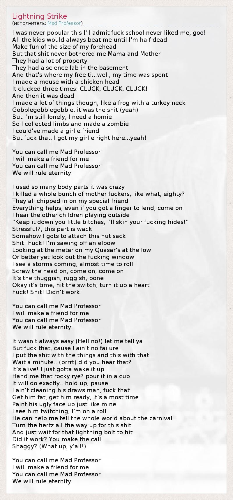 Я никогда не был популярен, это признаю, меня не любили в школе, фуу! До полусмерти бит бывал я, все дети Вечно насмехались над моею головой. 1 Но эта ерунда меня не волновала, ведь мама и мать – У них дофига чего во владенье, У них даже лаборатория в застенке. Там текло моё свободное вре... ладно, всё моё время. Тогда же я создал мышь с головой цыпленка, И ведь она даже закудахтала тогда: куда-тата, 2 Но все равно померла. Но я продолжал создавать разные штуковины, такие как лягушка на шее индюшки, Кулдыккулдыккулдык, вот д*рьмо-то, да уж... Но я всё еще одинок, мне нужен друг, Поэтому я собирал части тела и сделал зомби. Я мог бы сделать и подружку, но, К черту, моя подружка всегда при мне... о, да! 3 Мы можешь звать меня Безумный профессор, Я сделаю себе дружка. Ты можешь звать меня Безумный профессор, Вместе мы будем править всегда. Мне понадобилось дофига частей тела, безумие, Я убил целую кучу засранцев, кажется, их было около восьмидесяти? Все они сложились в моего дорогого друга. Всё идет в дело, даже если придется одолжить свой палец, я продолжаю. Я слышу, как другие дети играют во дворе. "Ну-ну, играйте, маленькие с*ки, я спущу с вас ваши шкуры!" Напряжение? На этом этапе всё шло паршиво. Кое-как я умудрился приляпать ему мошонку. Черт! Черт! Я отпилил ему локоть, На Квазаре 4 отметка на нуле. Лучше обратить свой взор к чертову окну: Шторм приближается, время выкатывать пришло. Прикручиваю ему голову, давай, давай же! На вид как неотесанный головорез, 5 Итак, время, переключатель, работай сердце! Черт! Черт! Не сработало... Мы можешь звать меня Безумный профессор, Я сделаю себе дружка. Ты можешь звать меня Безумный профессор, Вместе мы будем править всегда. Не всегда бывало просто (Это точно), позвольте доложить, Но к черту, это не может быть провал, ведь Я соединил эту фиговину с той хренью и то с этим Погоди-ка минуту (пук) 6 ты это слышал? Да он живой! Мне надо только его расшевелить! Мне нужно Рок Рю 7, налить в стакан - Это точно сработает. Погоди, стой! Ему надо сменить трусы, а ладно, пофиг. Он жирный, почти готов, время почти пришло. Раскрашу ему рожу как мою. 8 Смотрю, он дергается, я так рад. Он не дождется, чтобы я рассказал всему миру о своем развлечении. Врубить сердце на полную ради такого дела И подождать, пока не ударит молния. Сработало? Окликну-ка его! Шэгги? 9 (Чего вам всем надо?) Мы можешь звать меня Безумный профессор, Я сделаю себе дружка. Ты можешь звать меня Безумный профессор, Вместе мы будем править всегда. 1 - размер головы Violent J действительно впечатляющий 2 - cluck – звук имитирующий кудахтанье 3 - имеется в виду, что он сам всегда может себя удовлетворить 4 - Квазар – прибор для измерения энергии 5 - Отсылка к песне Bones-n-Thugs Harmony "Thuggish Ruggish bone" 6 - Созданное существо выпускает газы 7 - Rock Rye – вкус напитка Faygo, который частенько выливается на слушателей на концертах ICP 8 - ICP раскрашивают свои лица в клоунские гримасы 9 - Его создание оказывается его партнером по группе Shaggy2Dope.
