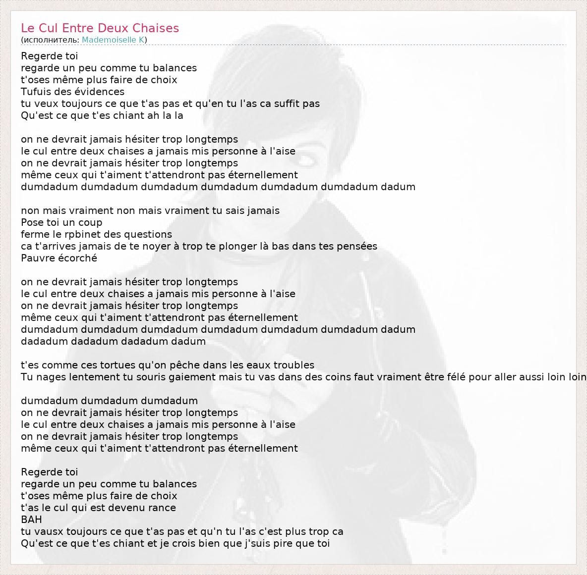 А как ты думаешь, о чем песня "Le Cul Entre Deux Chaises" ?