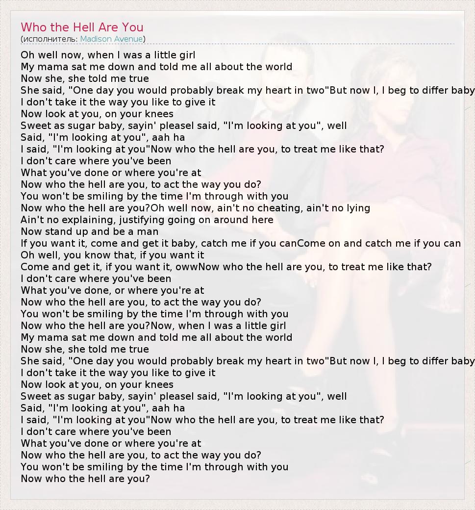 А как ты думаешь, о чем песня "Who the Hell Are You" ?