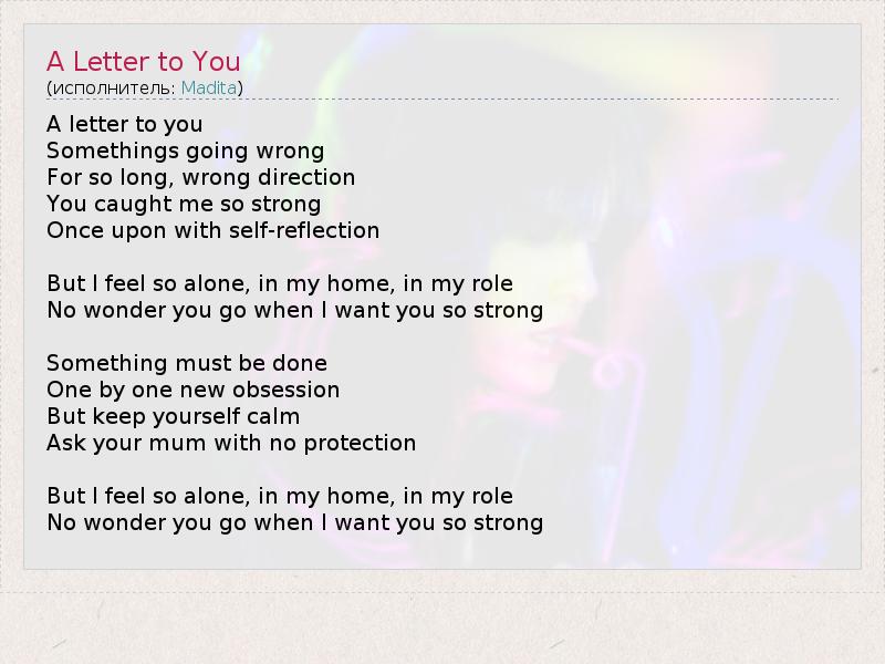 A letter to you Somethings going wrong For so long, wrong direction You caught me so strong Once upon with self-reflection But I feel so alone, in my home, in my role No wonder you go when I want you so strong Something must be done One by one new obsession But keep yourself calm Ask your mum with no protection But I feel so alone, in my home, in my role No wonder you go when I want you so strong
