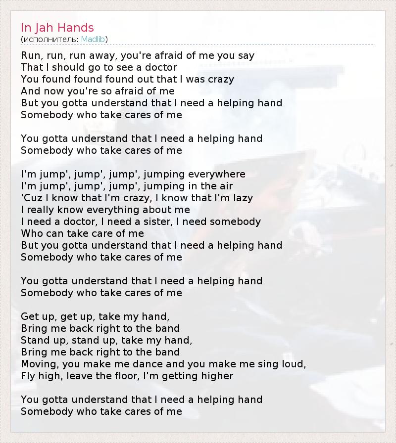 Беги, беги, убегай, ты боишься меня, ты говоришь, Что мне нужно обратиться к врачу, Ты выяснил, выяснил, выяснил, что я сумасшедшая, И сейчас ты так боишься меня, Но ты должен понять, что мне нужна рука помощи, Кто-то должен позаботиться обо мне. Ты должен понять, что мне нужна рука помощи, Кто-то должен позаботиться обо мне. Я скачу повсюду, Я подпрыгиваю в воздух, Ведь я знаю, что я сумасшедшая, я знаю, что я ленивая, Я правда знаю все о себе, Мне нужен доктор, нужна сестра, нужен кто-то, Кто сможет позаботиться обо мне, Но ты должен понять, что мне нужна рука помощи, Кто-то должен позаботиться обо мне. Ты должен понять, что мне нужна рука помощи, Кто-то должен позаботиться обо мне. Вставай, вставай, возьми мою руку, Верни меня обратно в группу, Вставай, вставай, возьми мою руку, Верни меня обратно в группу, Двигаясь, ты заставляешь меня танцевать и громко петь, Лети высоко, оторвись от пола, я поднимаюсь выше. Ты должен понять, что мне нужна рука помощи, Кто-то должен позаботиться обо мне.