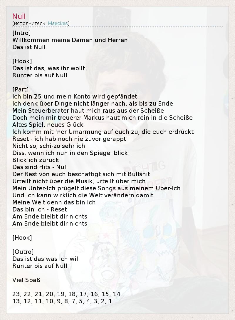 [Intro] Willkommen meine Damen und Herren Das ist Null [Hook] Das ist das, was ihr wollt Runter bis auf Null [Part] Ich bin 25 und mein Konto wird gepfändet Ich denk über Dinge nicht länger nach, als bis zu Ende Mein Steuerberater haut mich raus aus der Scheiße Doch mein mir treuerer Markus haut mich rein in die Scheiße Altes Spiel, neues Glück Ich komm mit 'ner Umarmung auf euch zu, die euch erdrückt Reset - ich hab noch nie zuvor gerappt Nicht so, schi-zo sehr ich Diss, wenn ich nun in den Spiegel blick Blick ich zurück Das sind Hits - Null Der Rest von euch beschäftigt sich mit Bullshit Urteilt nicht über die Musik, urteilt über mich Mein Unter-Ich prügelt diese Songs aus meinem Über-Ich Und ich kann wirklich die Welt verändern damit Meine Welt denn das bin ich Das bin ich - Reset Am Ende bleibt dir nichts Am Ende bleibt dir nichts [Hook] [Outro] Das ist das was ich will Runter bis auf Null Viel Spaß 23, 22, 21, 20, 19, 18, 17, 16, 15, 14 13, 12, 11, 10, 9, 8, 7, 5, 4, 3, 2, 1
