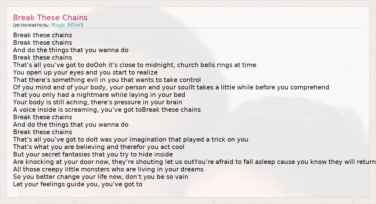 Break these chains Break these chains And do the things that you wanna do Break these chains That's all you've got to doOoh it's close to midnight, church bells rings at time You open up your eyes and you start to realize That there's something evil in you that wants to take control Of you mind and of your body, your person and your soulIt takes a little while before you comprehend That you only had a nightmare while laying in your bed Your body is still aching, there's pressure in your brain A voice inside is screaming, you've got toBreak these chains Break these chains And do the things that you wanna do Break these chains That's all you've got to doIt was your imagination that played a trick on you That's what you are believing and therefor you act cool But your secret fantasies that you try to hide inside Are knocking at your door now, they're shouting let us outYou're afraid to fall asleep cause you know they will return All those creepy little monsters who are living in your dreams So you better change your life now, don't you be so vain Let your feelings guide you, you've got to