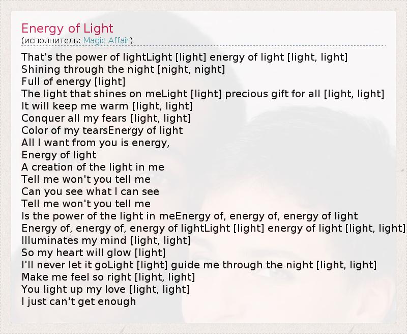 That's the power of lightLight [light] energy of light [light, light] Shining through the night [night, night] Full of energy [light] The light that shines on meLight [light] precious gift for all [light, light] It will keep me warm [light, light] Conquer all my fears [light, light] Color of my tearsEnergy of light All I want from you is energy, Energy of light A creation of the light in me Tell me won't you tell me Can you see what I can see Tell me won't you tell me Is the power of the light in meEnergy of, energy of, energy of light Energy of, energy of, energy of lightLight [light] energy of light [light, light] Illuminates my mind [light, light] So my heart will glow [light] I'll never let it goLight [light] guide me through the night [light, light] Make me feel so right [light, light] You light up my love [light, light] I just can't get enough