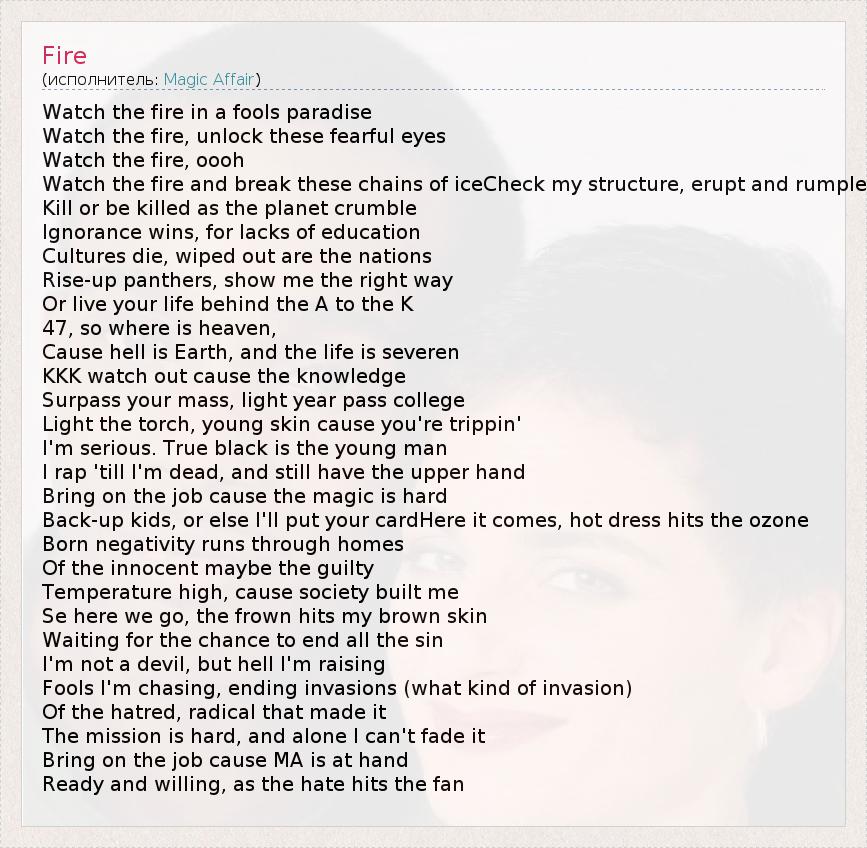 Watch the fire in a fools paradise Watch the fire, unlock these fearful eyes Watch the fire, oooh Watch the fire and break these chains of iceCheck my structure, erupt and rumple Kill or be killed as the planet crumble Ignorance wins, for lacks of education Cultures die, wiped out are the nations Rise-up panthers, show me the right way Or live your life behind the A to the K 47, so where is heaven, Cause hell is Earth, and the life is severen KKK watch out cause the knowledge Surpass your mass, light year pass college Light the torch, young skin cause you're trippin' I'm serious. True black is the young man I rap 'till I'm dead, and still have the upper hand Bring on the job cause the magic is hard Back-up kids, or else I'll put your cardHere it comes, hot dress hits the ozone Born negativity runs through homes Of the innocent maybe the guilty Temperature high, cause society built me Se here we go, the frown hits my brown skin Waiting for the chance to end all the sin I'm not a devil, but hell I'm raising Fools I'm chasing, ending invasions (what kind of invasion) Of the hatred, radical that made it The mission is hard, and alone I can't fade it Bring on the job cause MA is at hand Ready and willing, as the hate hits the fan