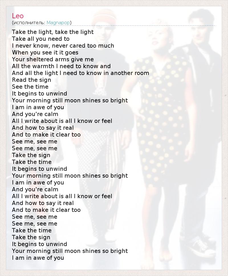 Take the light, take the light Take all you need to I never know, never cared too much When you see it it goes Your sheltered arms give me All the warmth I need to know and And all the light I need to know in another room Read the sign See the time It begins to unwind Your morning still moon shines so bright I am in awe of you And you're calm All I write about is all I know or feel And how to say it real And to make it clear too See me, see me See me, see me Take the sign Take the time It begins to unwind Your morning still moon shines so bright I am in awe of you And you're calm All I write about is all I know or feel And how to say it real And to make it clear too See me, see me See me, see me Take the time Take the sign It begins to unwind Your morning still moon shines so bright I am in awe of you
