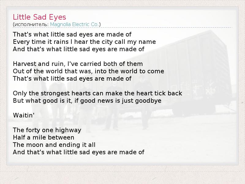 А как ты думаешь, о чем песня "Little Sad Eyes" ?
