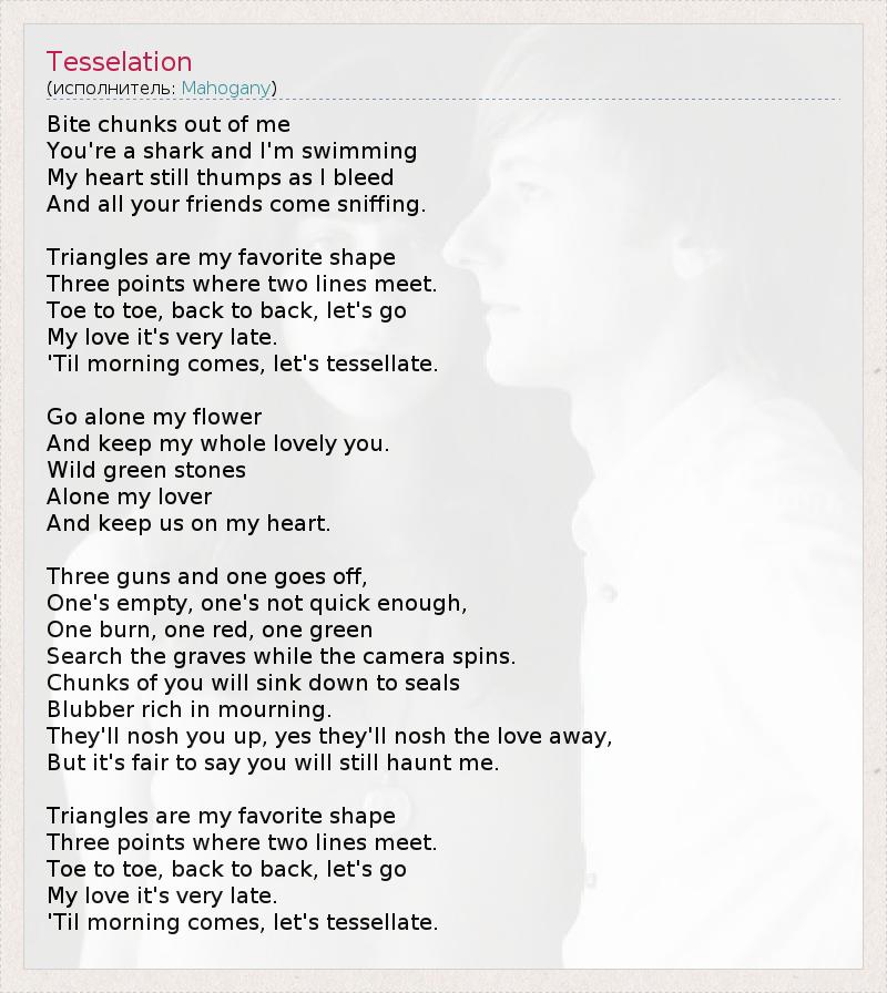 Bite chunks out of me You're a shark and I'm swimming My heart still thumps as I bleed And all your friends come sniffing. Triangles are my favorite shape Three points where two lines meet. Toe to toe, back to back, let's go My love it's very late. 'Til morning comes, let's tessellate. Go alone my flower And keep my whole lovely you. Wild green stones Alone my lover And keep us on my heart. Three guns and one goes off, One's empty, one's not quick enough, One burn, one red, one green Search the graves while the camera spins. Chunks of you will sink down to seals Blubber rich in mourning. They'll nosh you up, yes they'll nosh the love away, But it's fair to say you will still haunt me. Triangles are my favorite shape Three points where two lines meet. Toe to toe, back to back, let's go My love it's very late. 'Til morning comes, let's tessellate.