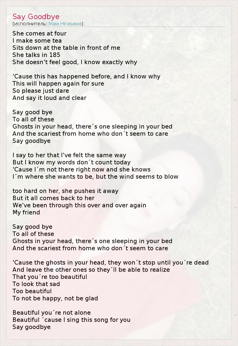 She comes at four I make some tea Sits down at the table in front of me She talks in 185 She doesn't feel good, I know exactly why 'Cause this has happened before, and I know why This will happen again for sure So please just dare And say it loud and clear Say good bye To all of these Ghosts in your head, there´s one sleeping in your bed And the scariest from home who don´t seem to care Say goodbye I say to her that I've felt the same way But I know my words don´t count today 'Cause I´m not there right now and she knows I´m where she wants to be, but the wind seems to blow too hard on her, she pushes it away But it all comes back to her We've been through this over and over again My friend Say good bye To all of these Ghosts in your head, there´s one sleeping in your bed And the scariest from home who don´t seem to care 'Cause the ghosts in your head, they won´t stop until you´re dead And leave the other ones so they´ll be able to realize That you´re too beautiful To look that sad Too beautiful To not be happy, not be glad Beautiful you´re not alone Beautiful ´cause I sing this song for you Say goodbye