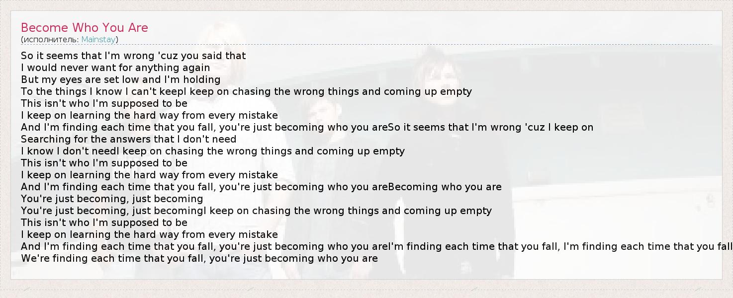So it seems that I'm wrong 'cuz you said that I would never want for anything again But my eyes are set low and I'm holding To the things I know I can't keepI keep on chasing the wrong things and coming up empty This isn't who I'm supposed to be I keep on learning the hard way from every mistake And I'm finding each time that you fall, you're just becoming who you areSo it seems that I'm wrong 'cuz I keep on Searching for the answers that I don't need I know I don't needI keep on chasing the wrong things and coming up empty This isn't who I'm supposed to be I keep on learning the hard way from every mistake And I'm finding each time that you fall, you're just becoming who you areBecoming who you are You're just becoming, just becoming You're just becoming, just becomingI keep on chasing the wrong things and coming up empty This isn't who I'm supposed to be I keep on learning the hard way from every mistake And I'm finding each time that you fall, you're just becoming who you areI'm finding each time that you fall, I'm finding each time that you fall We're finding each time that you fall, you're just becoming who you are