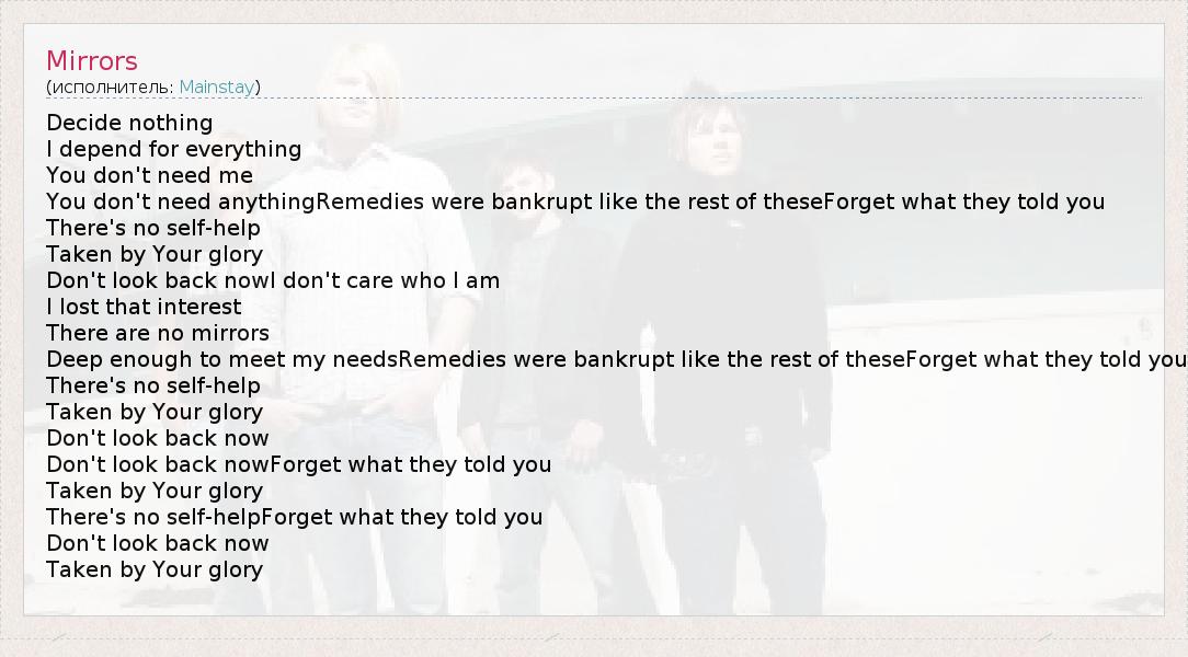 Decide nothing I depend for everything You don't need me You don't need anythingRemedies were bankrupt like the rest of theseForget what they told you There's no self-help Taken by Your glory Don't look back nowI don't care who I am I lost that interest There are no mirrors Deep enough to meet my needsRemedies were bankrupt like the rest of theseForget what they told you There's no self-help Taken by Your glory Don't look back now Don't look back nowForget what they told you Taken by Your glory There's no self-helpForget what they told you Don't look back now Taken by Your glory