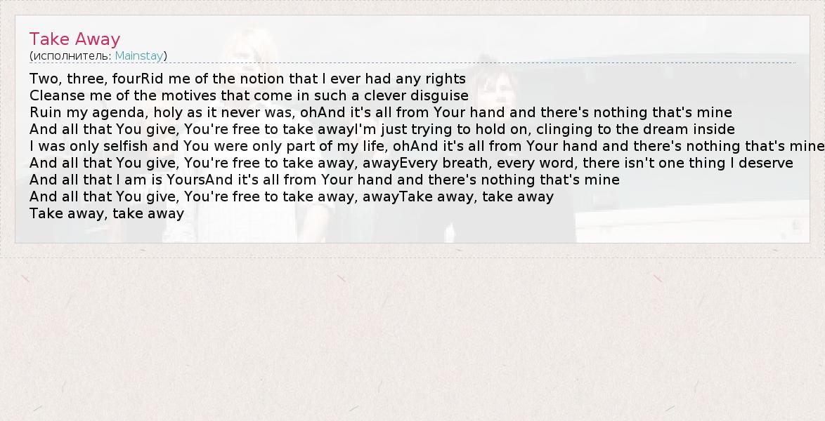 And all that You give, You're free to take away, awayEvery breath, every word, there isn't one thing I deserve
