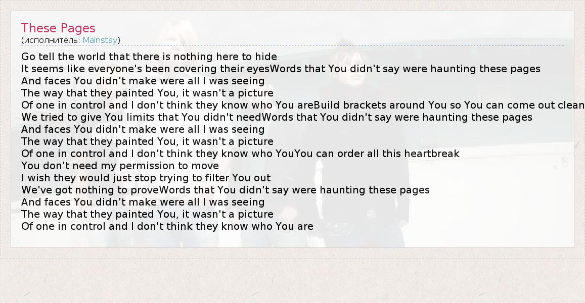 Go tell the world that there is nothing here to hide It seems like everyone's been covering their eyesWords that You didn't say were haunting these pages And faces You didn't make were all I was seeing The way that they painted You, it wasn't a picture Of one in control and I don't think they know who You areBuild brackets around You so You can come out clean We tried to give You limits that You didn't needWords that You didn't say were haunting these pages And faces You didn't make were all I was seeing The way that they painted You, it wasn't a picture Of one in control and I don't think they know who YouYou can order all this heartbreak You don't need my permission to move I wish they would just stop trying to filter You out We've got nothing to proveWords that You didn't say were haunting these pages And faces You didn't make were all I was seeing The way that they painted You, it wasn't a picture Of one in control and I don't think they know who You are