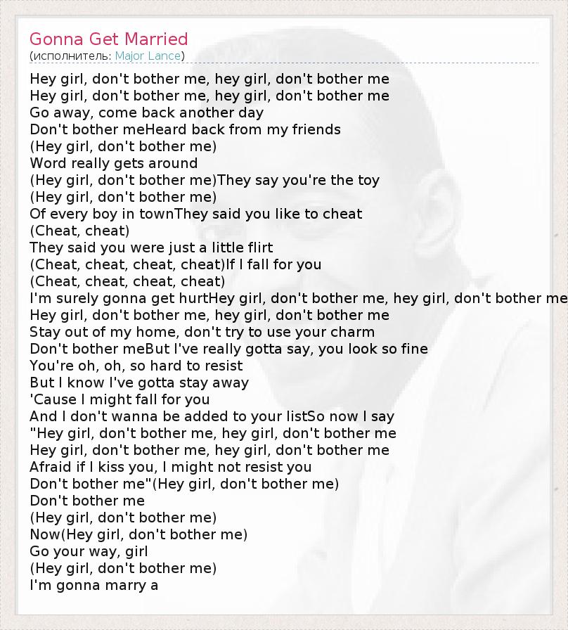 Hey girl, don't bother me, hey girl, don't bother me Hey girl, don't bother me, hey girl, don't bother me Go away, come back another day Don't bother meHeard back from my friends (Hey girl, don't bother me) Word really gets around (Hey girl, don't bother me)They say you're the toy (Hey girl, don't bother me) Of every boy in townThey said you like to cheat (Cheat, cheat) They said you were just a little flirt (Cheat, cheat, cheat, cheat)If I fall for you (Cheat, cheat, cheat, cheat) I'm surely gonna get hurtHey girl, don't bother me, hey girl, don't bother me Hey girl, don't bother me, hey girl, don't bother me Stay out of my home, don't try to use your charm Don't bother meBut I've really gotta say, you look so fine You're oh, oh, so hard to resist But I know I've gotta stay away 'Cause I might fall for you And I don't wanna be added to your listSo now I say "Hey girl, don't bother me, hey girl, don't bother me Hey girl, don't bother me, hey girl, don't bother me Afraid if I kiss you, I might not resist you Don't bother me"(Hey girl, don't bother me) Don't bother me (Hey girl, don't bother me) Now(Hey girl, don't bother me) Go your way, girl (Hey girl, don't bother me) I'm gonna marry a