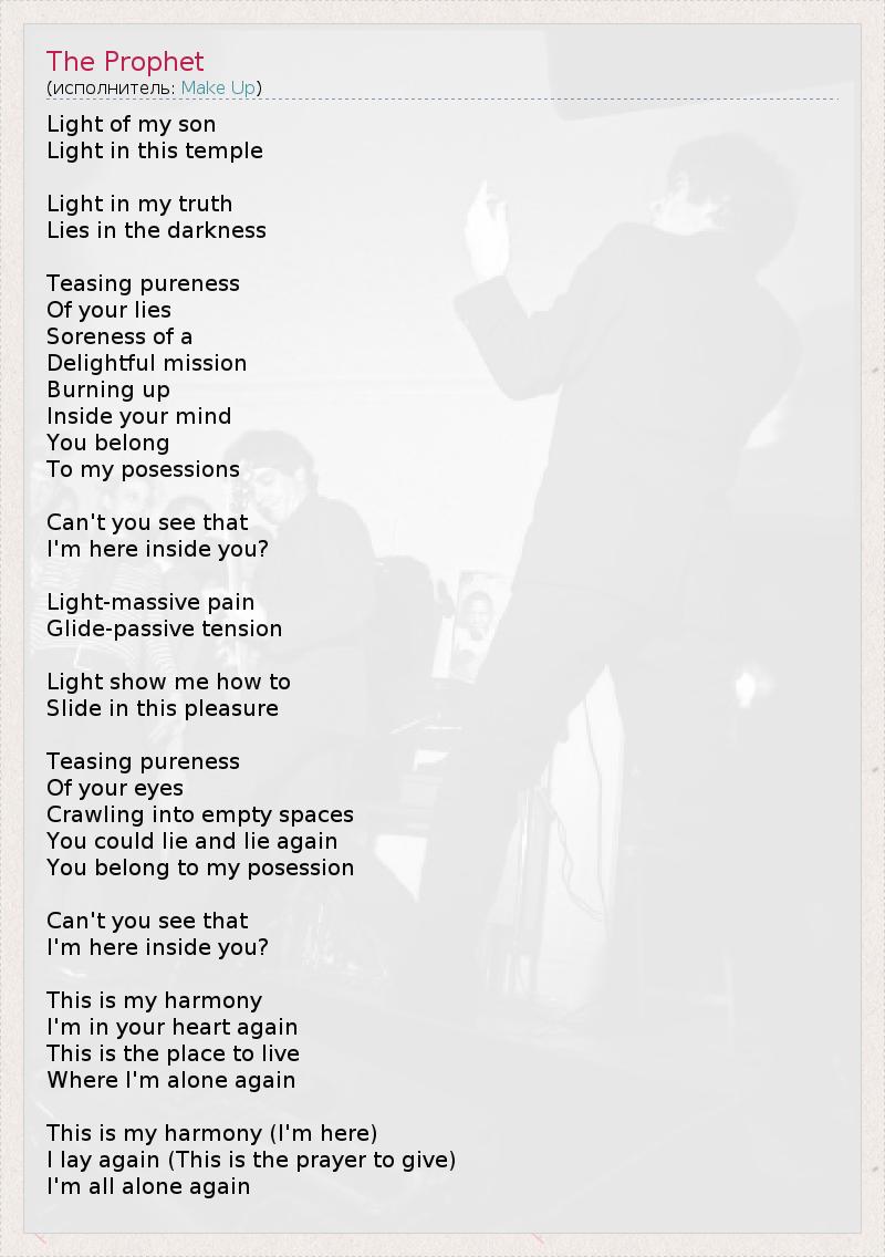 Свет моего солнца, Свет в этом храме… Свет моей правды, Обман во мраке… Дразнящая чистота Твоей лжи, Чувствительность Очаровательного задания Пылает В твоих мыслях. Ты – часть Моей собственности. Неужели ты не видишь, Что я – здесь, внутри тебя? Боль в масштабах света, Скользяще-пассивное напряжение… Свет, покажи мне, как Скользить в этом удовольствии… Дразнящая чистота Твоих глаз, Ползущая в пустые пространства… Ты мог бы лгать снова и снова, Ты принадлежишь мне. Неужели ты не видишь, Что я – здесь, внутри тебя? Это моя гармония, Я снова в твоём сердце, В этом месте я буду жить, Оставаясь в одиночестве. Это моя гармония (Я здесь), Я снова ложусь (Эту молитву нужно воздать), Я снова в полном одиночестве…
