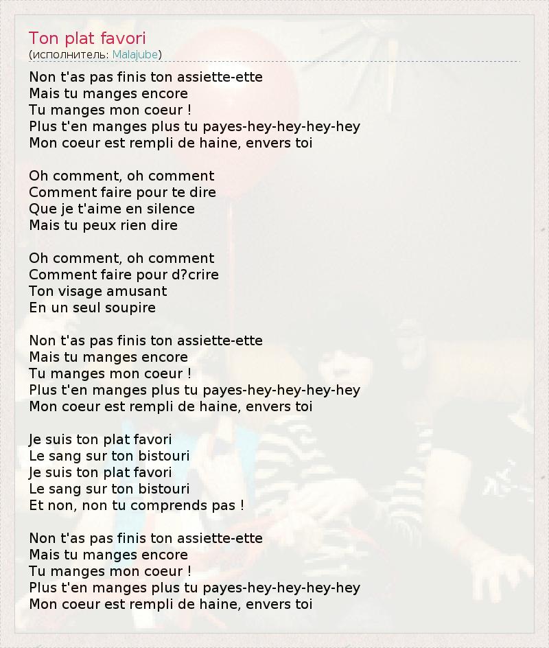 А как ты думаешь, о чем песня "Ton plat favori" ?