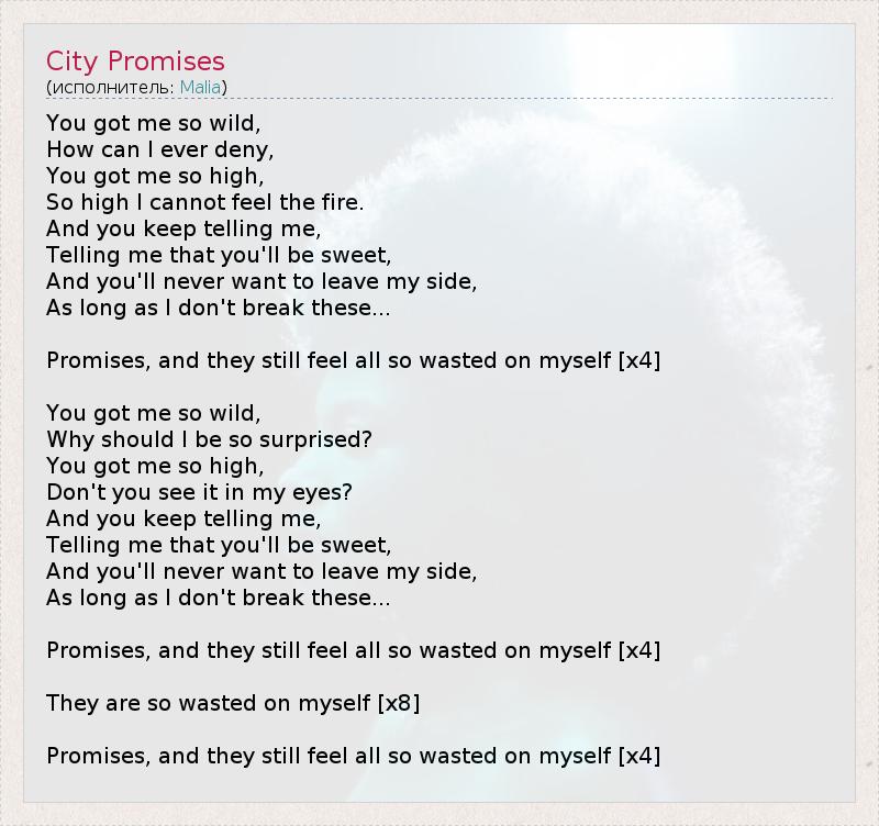 You got me so wild, How can I ever deny, You got me so high, So high I cannot feel the fire. And you keep telling me, Telling me that you'll be sweet, And you'll never want to leave my side, As long as I don't break these... Promises, and they still feel all so wasted on myself [x4] You got me so wild, Why should I be so surprised? You got me so high, Don't you see it in my eyes? And you keep telling me, Telling me that you'll be sweet, And you'll never want to leave my side, As long as I don't break these... Promises, and they still feel all so wasted on myself [x4] They are so wasted on myself [x8] Promises, and they still feel all so wasted on myself [x4]
