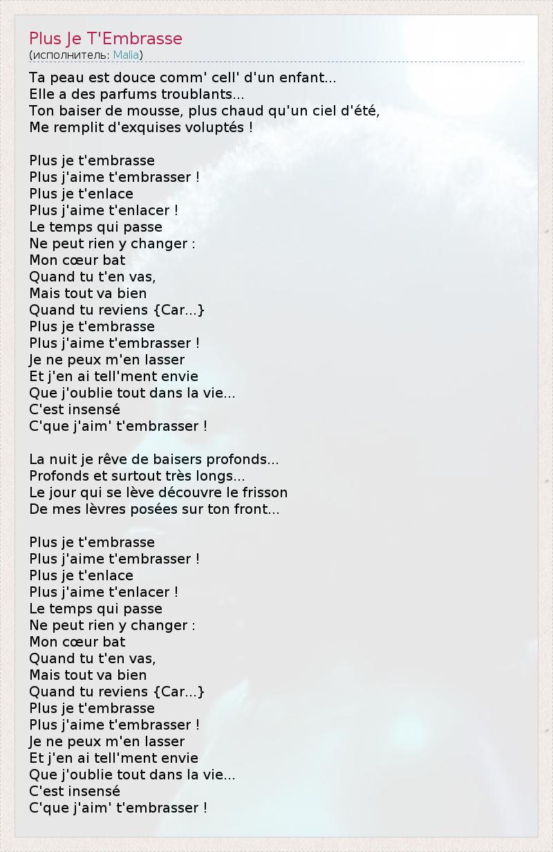 А как ты думаешь, о чем песня "Plus Je T'Embrasse" ?