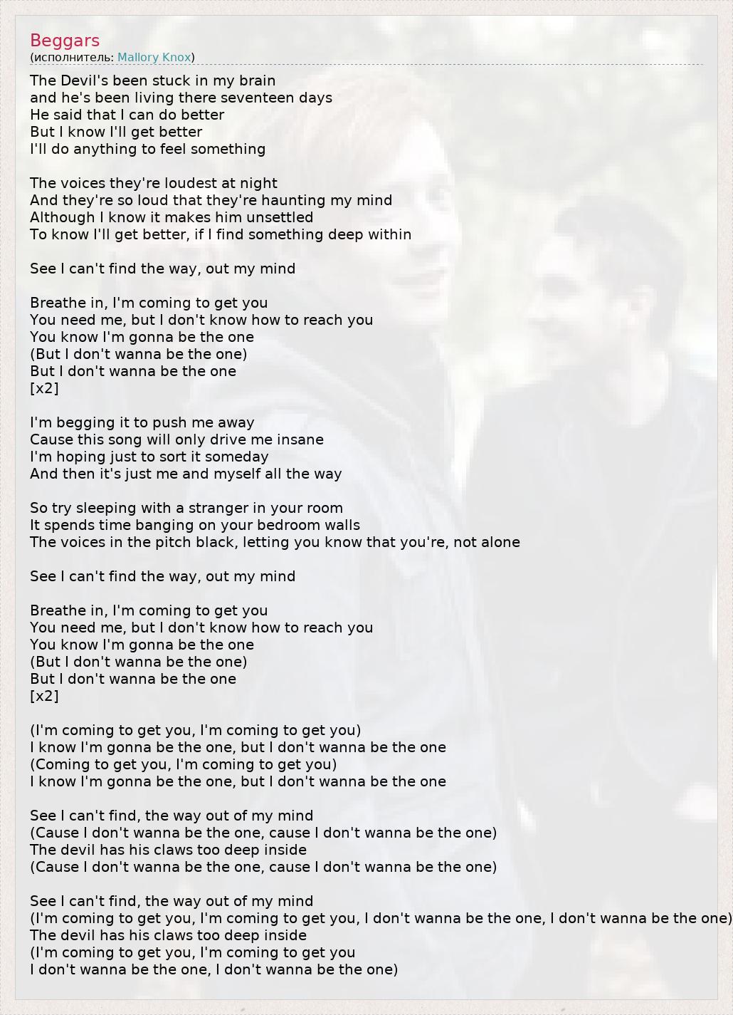 The Devil's been stuck in my brain and he's been living there seventeen days He said that I can do better But I know I'll get better I'll do anything to feel something The voices they're loudest at night And they're so loud that they're haunting my mind Although I know it makes him unsettled To know I'll get better, if I find something deep within See I can't find the way, out my mind Breathe in, I'm coming to get you You need me, but I don't know how to reach you You know I'm gonna be the one (But I don't wanna be the one) But I don't wanna be the one [x2] I'm begging it to push me away Cause this song will only drive me insane I'm hoping just to sort it someday And then it's just me and myself all the way So try sleeping with a stranger in your room It spends time banging on your bedroom walls The voices in the pitch black, letting you know that you're, not alone See I can't find the way, out my mind Breathe in, I'm coming to get you You need me, but I don't know how to reach you You know I'm gonna be the one (But I don't wanna be the one) But I don't wanna be the one [x2] (I'm coming to get you, I'm coming to get you) I know I'm gonna be the one, but I don't wanna be the one (Coming to get you, I'm coming to get you) I know I'm gonna be the one, but I don't wanna be the one See I can't find, the way out of my mind (Cause I don't wanna be the one, cause I don't wanna be the one) The devil has his claws too deep inside (Cause I don't wanna be the one, cause I don't wanna be the one) See I can't find, the way out of my mind (I'm coming to get you, I'm coming to get you, I don't wanna be the one, I don't wanna be the one) The devil has his claws too deep inside (I'm coming to get you, I'm coming to get you I don't wanna be the one, I don't wanna be the one)