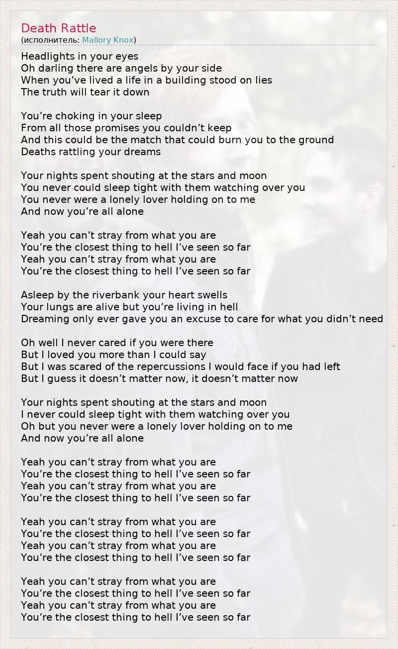 Headlights in your eyes Oh darling there are angels by your side When you’ve lived a life in a building stood on lies The truth will tear it down You’re choking in your sleep From all those promises you couldn’t keep And this could be the match that could burn you to the ground Deaths rattling your dreams Your nights spent shouting at the stars and moon You never could sleep tight with them watching over you You never were a lonely lover holding on to me And now you’re all alone Yeah you can’t stray from what you are You’re the closest thing to hell I’ve seen so far Yeah you can’t stray from what you are You’re the closest thing to hell I’ve seen so far Asleep by the riverbank your heart swells Your lungs are alive but you’re living in hell Dreaming only ever gave you an excuse to care for what you didn’t need Oh well I never cared if you were there But I loved you more than I could say But I was scared of the repercussions I would face if you had left But I guess it doesn’t matter now, it doesn’t matter now Your nights spent shouting at the stars and moon I never could sleep tight with them watching over you Oh but you never were a lonely lover holding on to me And now you’re all alone Yeah you can’t stray from what you are You’re the closest thing to hell I’ve seen so far Yeah you can’t stray from what you are You’re the closest thing to hell I’ve seen so far Yeah you can’t stray from what you are You’re the closest thing to hell I’ve seen so far Yeah you can’t stray from what you are You’re the closest thing to hell I’ve seen so far Yeah you can’t stray from what you are You’re the closest thing to hell I’ve seen so far Yeah you can’t stray from what you are You’re the closest thing to hell I’ve seen so far