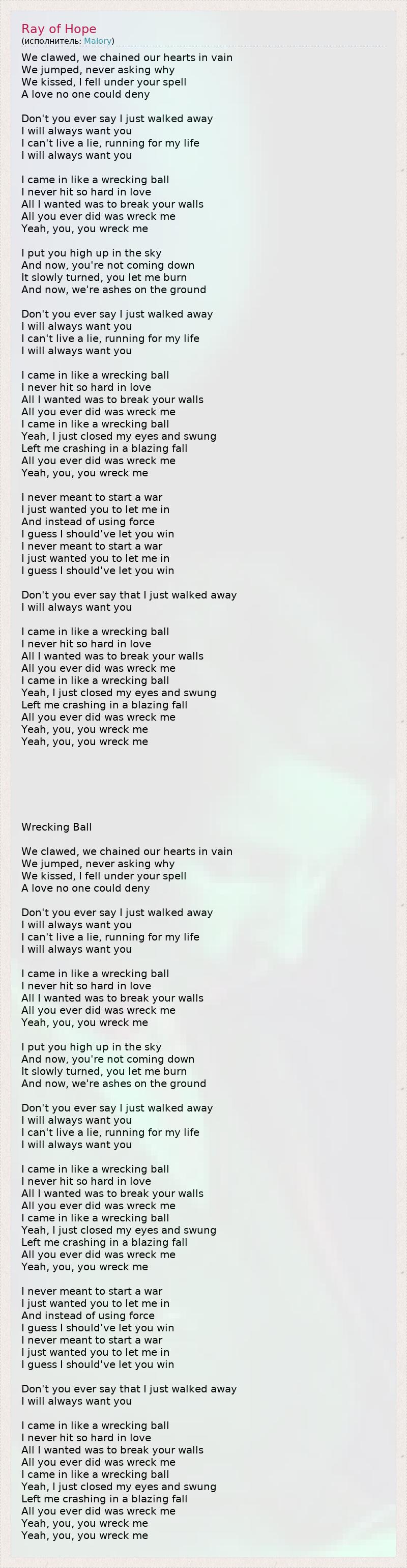 We clawed, we chained our hearts in vain We jumped, never asking why We kissed, I fell under your spell A love no one could deny Don't you ever say I just walked away I will always want you I can't live a lie, running for my life I will always want you I came in like a wrecking ball I never hit so hard in love All I wanted was to break your walls All you ever did was wreck me Yeah, you, you wreck me I put you high up in the sky And now, you're not coming down It slowly turned, you let me burn And now, we're ashes on the ground Don't you ever say I just walked away I will always want you I can't live a lie, running for my life I will always want you I came in like a wrecking ball I never hit so hard in love All I wanted was to break your walls All you ever did was wreck me I came in like a wrecking ball Yeah, I just closed my eyes and swung Left me crashing in a blazing fall All you ever did was wreck me Yeah, you, you wreck me I never meant to start a war I just wanted you to let me in And instead of using force I guess I should've let you win I never meant to start a war I just wanted you to let me in I guess I should've let you win Don't you ever say that I just walked away I will always want you I came in like a wrecking ball I never hit so hard in love All I wanted was to break your walls All you ever did was wreck me I came in like a wrecking ball Yeah, I just closed my eyes and swung Left me crashing in a blazing fall All you ever did was wreck me Yeah, you, you wreck me Yeah, you, you wreck me Wrecking Ball We clawed, we chained our hearts in vain We jumped, never asking why We kissed, I fell under your spell A love no one could deny Don't you ever say I just walked away I will always want you I can't live a lie, running for my life I will always want you I came in like a wrecking ball I never hit so hard in love All I wanted was to break your walls All you ever did was wreck me Yeah, you, you wreck me I put you high up in the sky And now, you're not coming down It slowly turned, you let me burn And now, we're ashes on the ground Don't you ever say I just walked away I will always want you I can't live a lie, running for my life I will always want you I came in like a wrecking ball I never hit so hard in love All I wanted was to break your walls All you ever did was wreck me I came in like a wrecking ball Yeah, I just closed my eyes and swung Left me crashing in a blazing fall All you ever did was wreck me Yeah, you, you wreck me I never meant to start a war I just wanted you to let me in And instead of using force I guess I should've let you win I never meant to start a war I just wanted you to let me in I guess I should've let you win Don't you ever say that I just walked away I will always want you I came in like a wrecking ball I never hit so hard in love All I wanted was to break your walls All you ever did was wreck me I came in like a wrecking ball Yeah, I just closed my eyes and swung Left me crashing in a blazing fall All you ever did was wreck me Yeah, you, you wreck me Yeah, you, you wreck me