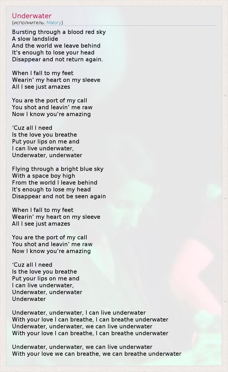Проношусь по кроваво-красному небу, Медленный обвал – И наш мир остаётся позади. Этого достаточно, чтобы потерять голову, Исчезнуть и больше не появляться. Когда я падаю к своим ногам, Раскрывая свои эмоции, Всё, что охватывает взгляд, поразительно. Ты – порт моей приписки, Ты ранишь и оставляешь меня беззащитным, Теперь я знаю, что ты восхитительна. Ведь всё, в чём я нуждаюсь – Дыхание твоей любви. Прикоснись ко мне губами, И я смогу жить под водой, Под водой, под водой. Пролетаю по ярко-голубому небу, Космический мальчик высоко От мира, который я оставляю позади. Этого достаточно, чтобы потерять голову, Исчезнуть и больше не появляться. Когда я падаю к своим ногам, Раскрывая свои эмоции, Всё, что охватывает взгляд, поразительно. Ты – порт моей приписки, Ты ранишь и оставляешь меня беззащитным, Теперь я знаю, что ты восхитительна. Ведь всё, в чём я нуждаюсь – Дыхание твоей любви. Прикоснись ко мне губами, И я смогу жить под водой, Под водой, под водой, Под водой!.. Под водой, под водой, я могу жить под водой, С твоей любовью я могу дышать, могу дышать под водой! Под водой, под водой, мы можем жить под водой, С твоей любовью я могу дышать, могу дышать под водой! Под водой, под водой, мы можем жить под водой, С твоей любовью я могу дышать, могу дышать под водой!