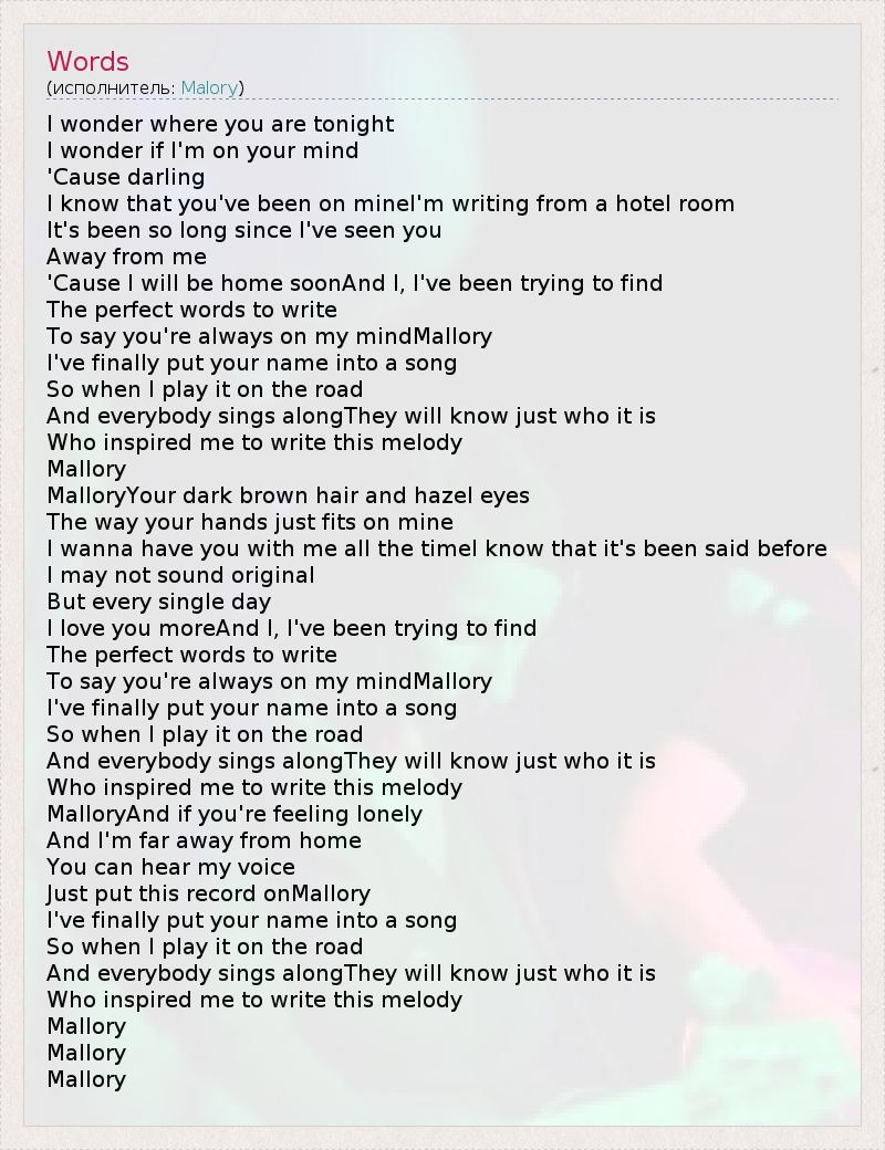 I wonder where you are tonight I wonder if I'm on your mind 'Cause darling I know that you've been on mineI'm writing from a hotel room It's been so long since I've seen you Away from me 'Cause I will be home soonAnd I, I've been trying to find The perfect words to write To say you're always on my mindMallory I've finally put your name into a song So when I play it on the road And everybody sings alongThey will know just who it is Who inspired me to write this melody Mallory MalloryYour dark brown hair and hazel eyes The way your hands just fits on mine I wanna have you with me all the timeI know that it's been said before I may not sound original But every single day I love you moreAnd I, I've been trying to find The perfect words to write To say you're always on my mindMallory I've finally put your name into a song So when I play it on the road And everybody sings alongThey will know just who it is Who inspired me to write this melody MalloryAnd if you're feeling lonely And I'm far away from home You can hear my voice Just put this record onMallory I've finally put your name into a song So when I play it on the road And everybody sings alongThey will know just who it is Who inspired me to write this melody Mallory Mallory Mallory