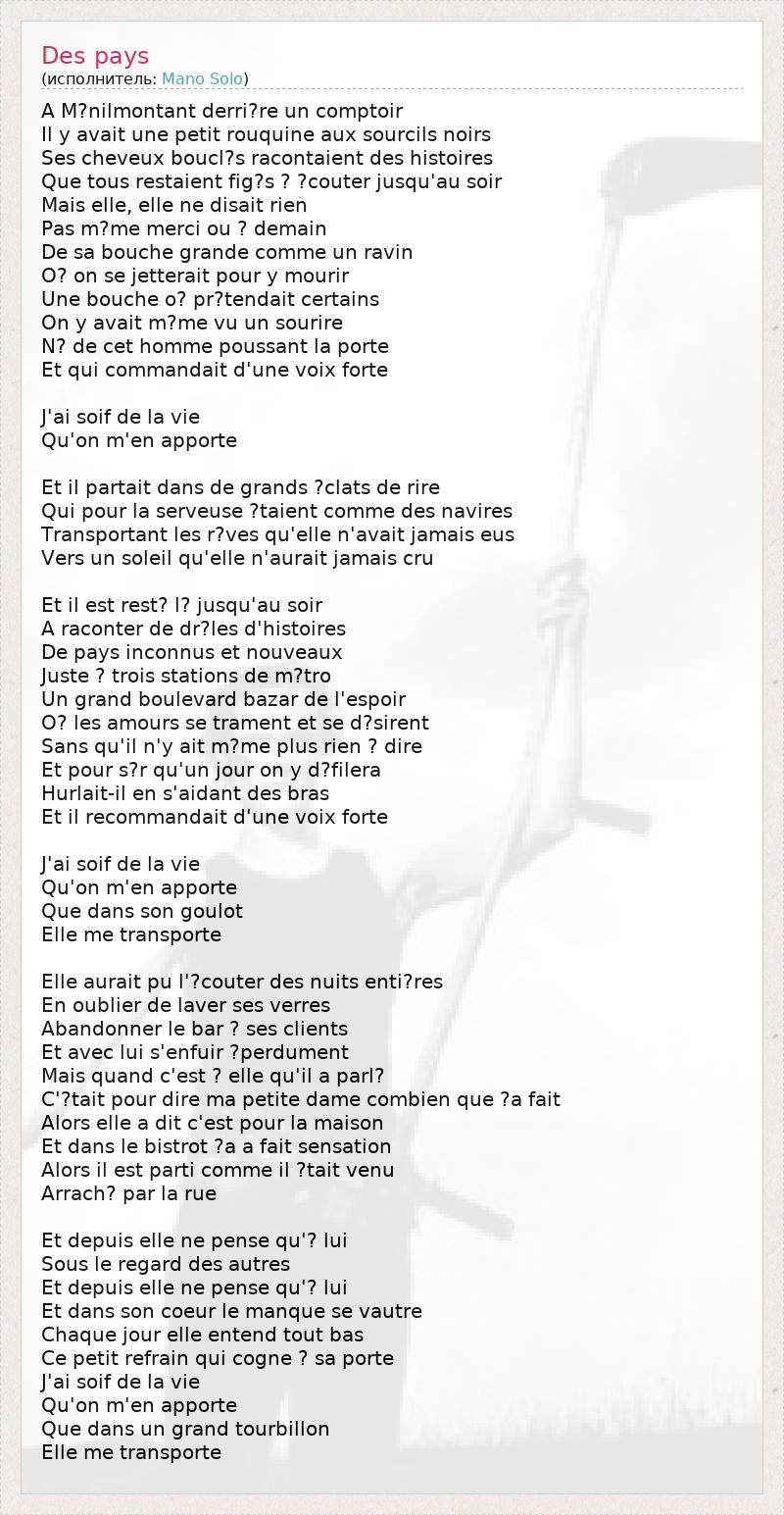 Это интересно:10 января 2010 года смолк, может быть, самый надрывный голос современной французской песни. Певец, автор и композитор Мано Соло ушел из жизни в 46 лет. Он был одним из тех, кому критики и журналисты отчаялись подыскать однозначное определение. «Своеобразный», «нетипичный»– такими словами пыталась пресса «отделаться» от неудобного и беспокойного артиста.Его называли «человеком с содранной... продолжение