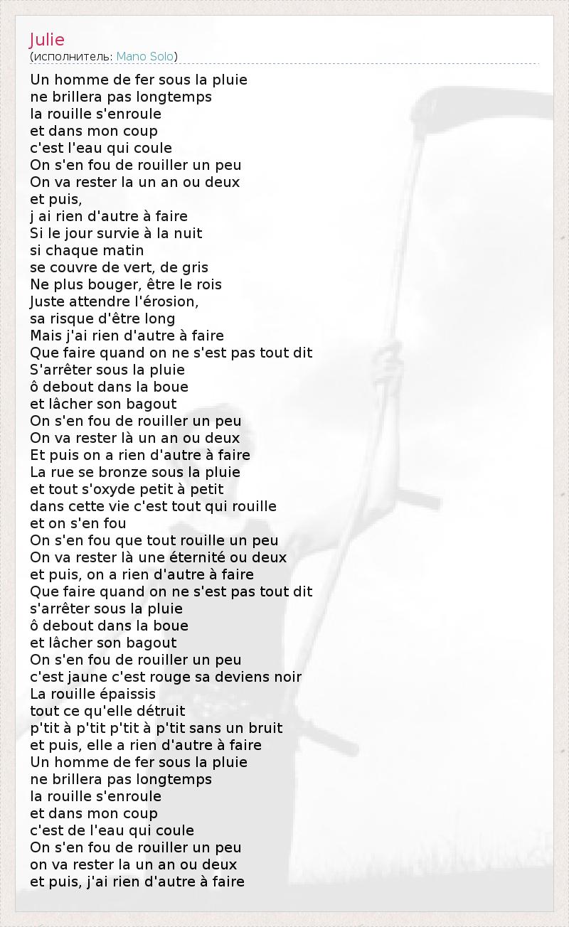 Это интересно:10 января 2010 года смолк, может быть, самый надрывный голос современной французской песни. Певец, автор и композитор Мано Соло ушел из жизни в 46 лет. Он был одним из тех, кому критики и журналисты отчаялись подыскать однозначное определение. «Своеобразный», «нетипичный»– такими словами пыталась пресса «отделаться» от неудобного и беспокойного артиста.Его называли «человеком с содранной... продолжение