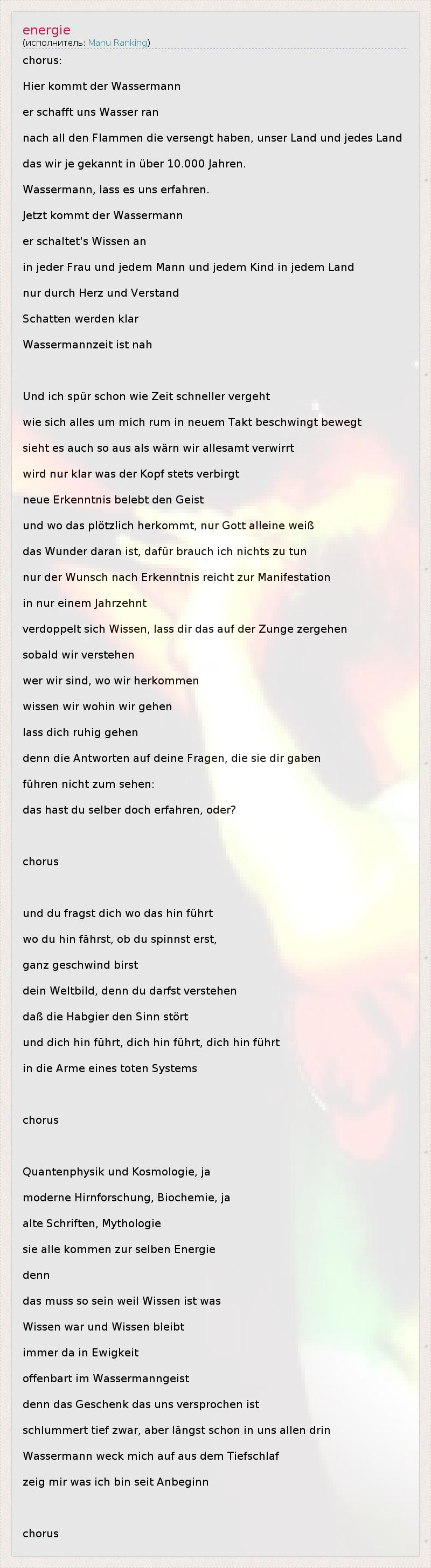 chorus: Hier kommt der Wassermann er schafft uns Wasser ran nach all den Flammen die versengt haben, unser Land und jedes Land das wir je gekannt in über 10.000 Jahren. Wassermann, lass es uns erfahren. Jetzt kommt der Wassermann er schaltet's Wissen an in jeder Frau und jedem Mann und jedem Kind in jedem Land nur durch Herz und Verstand Schatten werden klar Wassermannzeit ist nah Und ich spür schon wie Zeit schneller vergeht wie sich alles um mich rum in neuem Takt beschwingt bewegt sieht es auch so aus als wärn wir allesamt verwirrt wird nur klar was der Kopf stets verbirgt neue Erkenntnis belebt den Geist und wo das plötzlich herkommt, nur Gott alleine weiß das Wunder daran ist, dafür brauch ich nichts zu tun nur der Wunsch nach Erkenntnis reicht zur Manifestation in nur einem Jahrzehnt verdoppelt sich Wissen, lass dir das auf der Zunge zergehen sobald wir verstehen wer wir sind, wo wir herkommen wissen wir wohin wir gehen lass dich ruhig gehen denn die Antworten auf deine Fragen, die sie dir gaben führen nicht zum sehen: das hast du selber doch erfahren, oder? chorus und du fragst dich wo das hin führt wo du hin fährst, ob du spinnst erst, ganz geschwind birst dein Weltbild, denn du darfst verstehen daß die Habgier den Sinn stört und dich hin führt, dich hin führt, dich hin führt in die Arme eines toten Systems chorus Quantenphysik und Kosmologie, ja moderne Hirnforschung, Biochemie, ja alte Schriften, Mythologie sie alle kommen zur selben Energie denn das muss so sein weil Wissen ist was Wissen war und Wissen bleibt immer da in Ewigkeit offenbart im Wassermanngeist denn das Geschenk das uns versprochen ist schlummert tief zwar, aber längst schon in uns allen drin Wassermann weck mich auf aus dem Tiefschlaf zeig mir was ich bin seit Anbeginn chorus