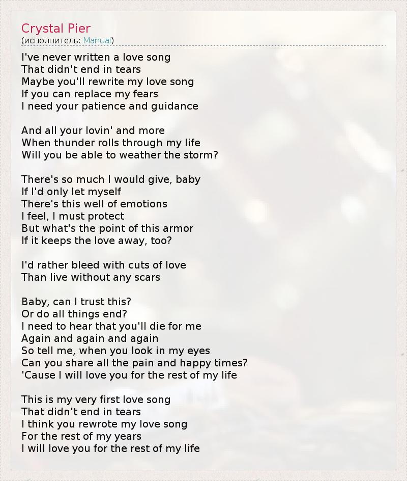 I've never written a love song That didn't end in tears Maybe you'll rewrite my love song If you can replace my fears I need your patience and guidance And all your lovin' and more When thunder rolls through my life Will you be able to weather the storm? There's so much I would give, baby If I'd only let myself There's this well of emotions I feel, I must protect But what's the point of this armor If it keeps the love away, too? I'd rather bleed with cuts of love Than live without any scars Baby, can I trust this? Or do all things end? I need to hear that you'll die for me Again and again and again So tell me, when you look in my eyes Can you share all the pain and happy times? 'Cause I will love you for the rest of my life This is my very first love song That didn't end in tears I think you rewrote my love song For the rest of my years I will love you for the rest of my life