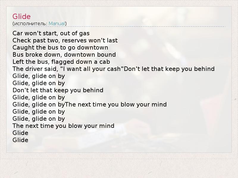 Car won't start, out of gas Check past two, reserves won't last Caught the bus to go downtown Bus broke down, downtown bound Left the bus, flagged down a cab The driver said, "I want all your cash"Don't let that keep you behind Glide, glide on by Glide, glide on by Don't let that keep you behind Glide, glide on by Glide, glide on byThe next time you blow your mind Glide, glide on by Glide, glide on by The next time you blow your mind Glide Glide