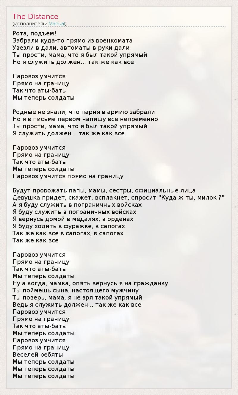 Рота, подъем! Забрали куда-то прямо из военкомата Увезли в дали, автоматы в руки дали Ты прости, мама, что я был такой упрямый Но я служить должен... так же как все Паровоз умчится Прямо на границу Так что аты-баты Мы теперь солдаты Родные не знали, что парня в армию забрали Но я в письме первом напишу все непременно Ты прости, мама, что я был такой упрямый Я служить должен... так же как все Паровоз умчится Прямо на границу Так что аты-баты Мы теперь солдаты Паровоз умчится прямо на границу Будут провожать папы, мамы, сестры, официальные лица Девушка придет, скажет, всплакнет, спросит "Куда ж ты, милок ?" А я буду служить в пограничных войсках Я буду служить в пограничных войсках Я вернусь домой в медалях, в орденах Я буду ходить в фуражке, в сапогах Так же как все в сапогах, в сапогах Так же как все Паровоз умчится Прямо на границу Так что аты-баты Мы теперь солдаты Ну а когда, мамка, опять вернусь я на гражданку Ты поймешь сына, настоящего мужчину Ты поверь, мама, я не зря такой упрямый Ведь я служить должен... так же как все Паровоз умчится Прямо на границу Так что аты-баты Мы теперь солдаты Паровоз умчится Прямо на границу Веселей ребяты Мы теперь солдаты Мы теперь солдаты Мы теперь солдаты