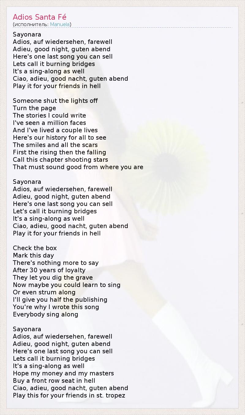 Прощай! Адьёс, ауфидерзейн, прощай! Адью, спокойной ночи, доброго вечера! Это - последняя песня, что сможешь ты продать. Давай назовём это горящими мостами, Ей так просто подпевать: Чао, адью, спокойной ночи, доброго вечера! Сыграй её для своих друзей в аду. Кто-то вырубил огни, Перевернул страницу Историй, что я мог написать. Я видел миллионы лиц, И я прожил пару жизней. Вот наша история, всем на обозрение: Улыбки и все шрамы, Сначала взлёт, потом паденье, Назови эту главу "Падающие звёзды" - Там, откуда ты, это должно звучать шикарно. Прощай! Адьёс, ауфидерзейн, прощай! Адью, спокойной ночи, доброго вечера! Это - последняя песня, что сможешь ты продать. Давай назовём это горящими мостами, Ей так просто подпевать: Чао, адью, спокойной ночи, доброго вечера! Сыграй её для своих друзей в аду. Поставь галочку, Отметь этот день, Что тут ещё скажешь? После 30 лет преданности Они позволили тебе вырыть себе могилу. Ну может хоть сейчас ты бы мог научиться петь, А может даже и подыгрывать, бренча на гитаре. Я отдам тебе половину тиража, Ведь именно ради тебя я написал эту песню. Все - подпевайте! Прощай! Адьёс, ауфидерзейн, прощай! Адью, спокойной ночи, доброго вечера! Это - последняя песня, что сможешь ты продать. Давай назовём это горящими мостами, Ей так просто подпевать. Надеюсь, мои деньги и мои записи Приобретут тебе место в первом ряду ада! Чао, адью, спокойной ночи, доброго вечера! Сыграй её для своих друзей в... Сан-Тропе!
