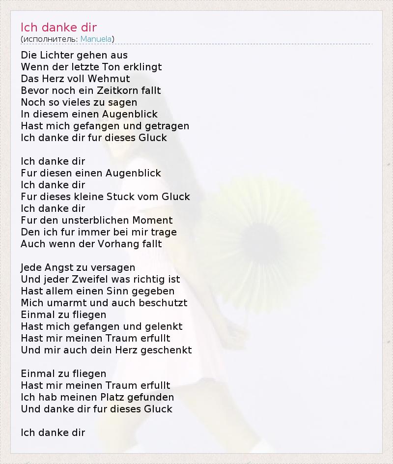 Огни погаснут, Когда отзвучит последний звук. Перед этим моментом Сердце наполняется тоской. Еще так много нужно сказать В это мгновение. Ты поймала меня и поддержала. Я благодарю тебя за это счастье. Я благодарю тебя За это мгновение. Я благодарю тебя За этот маленький кусочек счастья. Я благодарю тебя За бессмертный момент, Который я всегда ношу с собой, Даже когда занавес опускается. Лишиться всех страхов И сомнений - вот что правильно. Ты придала всему этому смысл, Обняла меня и защитила, Чтобы однажды взлететь. Ты меня поймала и направила, Исполнила мою мечту И подарила мне свое сердце. Взлететь однажды... Ты исполнила мою мечту, Я нашел свое место И благодарю тебя за это счастье. Я благодарю тебя.