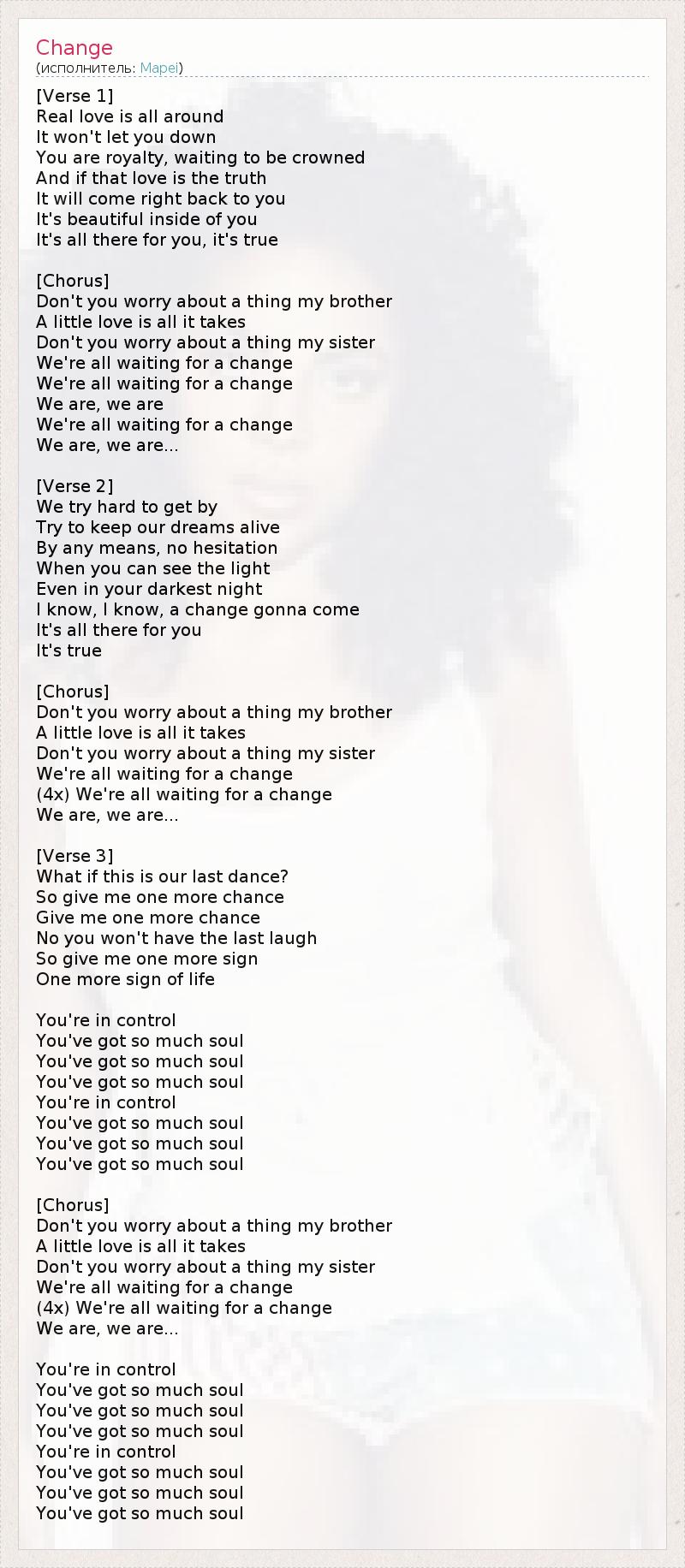[Verse 1] Real love is all around It won't let you down You are royalty, waiting to be crowned And if that love is the truth It will come right back to you It's beautiful inside of you It's all there for you, it's true [Chorus] Don't you worry about a thing my brother A little love is all it takes Don't you worry about a thing my sister We're all waiting for a change We're all waiting for a change We are, we are We're all waiting for a change We are, we are... [Verse 2] We try hard to get by Try to keep our dreams alive By any means, no hesitation When you can see the light Even in your darkest night I know, I know, a change gonna come It's all there for you It's true [Chorus] Don't you worry about a thing my brother A little love is all it takes Don't you worry about a thing my sister We're all waiting for a change (4x) We're all waiting for a change We are, we are... [Verse 3] What if this is our last dance? So give me one more chance Give me one more chance No you won't have the last laugh So give me one more sign One more sign of life You're in control You've got so much soul You've got so much soul You've got so much soul You're in control You've got so much soul You've got so much soul You've got so much soul [Chorus] Don't you worry about a thing my brother A little love is all it takes Don't you worry about a thing my sister We're all waiting for a change (4x) We're all waiting for a change We are, we are... You're in control You've got so much soul You've got so much soul You've got so much soul You're in control You've got so much soul You've got so much soul You've got so much soul