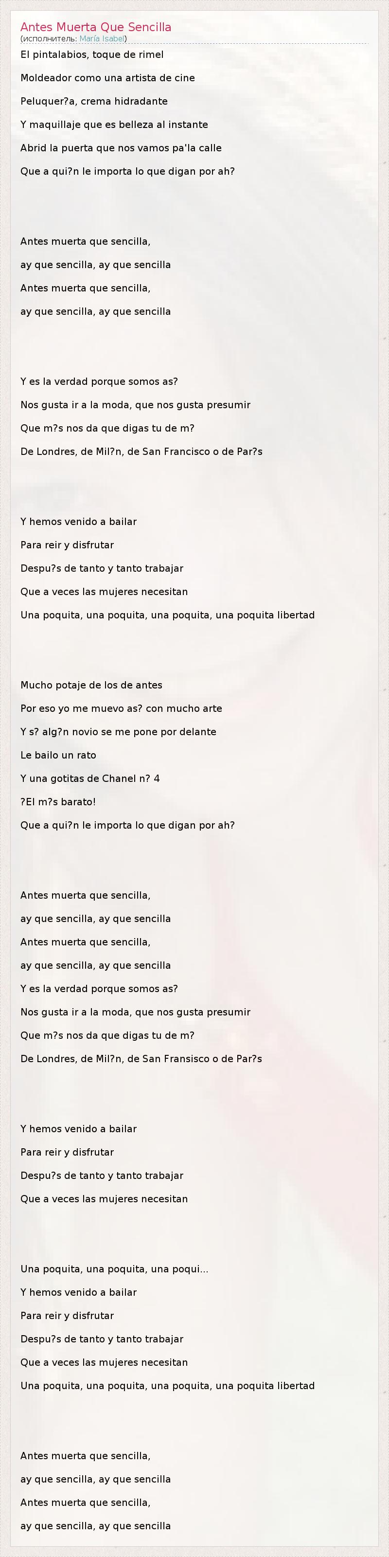ГлавнаяИсполнителиMaría IsabelAntes Muerta Que Sencilla