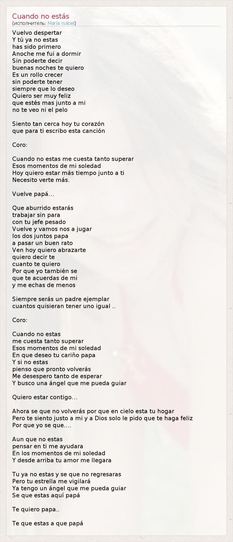 Vuelvo despertar Y tú ya no estas has sido primero Anoche me fui a dormir Sin poderte decir buenas noches te quiero Es un rollo crecer sin poderte tener siempre que lo deseo Quiero ser muy feliz que estés mas junto a mi no te veo ni el pelo Siento tan cerca hoy tu corazón que para ti escribo esta canción Coro: Cuando no estas me cuesta tanto superar Esos momentos de mi soledad Hoy quiero estar más tiempo junto a ti Necesito verte más. Vuelve papá… Que aburrido estarás trabajar sin para con tu jefe pesado Vuelve y vamos nos a jugar los dos juntos papa a pasar un buen rato Ven hoy quiero abrazarte quiero decir te cuanto te quiero Por que yo también se que te acuerdas de mi y me echas de menos Siempre serás un padre ejemplar cuantos quisieran tener uno igual .. Coro: Cuando no estas me cuesta tanto superar Esos momentos de mi soledad En que deseo tu cariño papa Y si no estas pienso que pronto volverás Me desespero tanto de esperar Y busco una ángel que me pueda guiar Quiero estar contigo… Ahora se que no volverás por que en cielo esta tu hogar Pero te siento justo a mi y a Dios solo le pido que te haga feliz Por que yo se que…. Aun que no estas pensar en ti me ayudara En los momentos de mi soledad Y desde arriba tu amor me llegara Tu ya no estas y se que no regresaras Pero tu estrella me vigilará Ya tengo un ángel que me pueda guiar Se que estas aquí papá Te quiero papa.. Te que estas a que papá