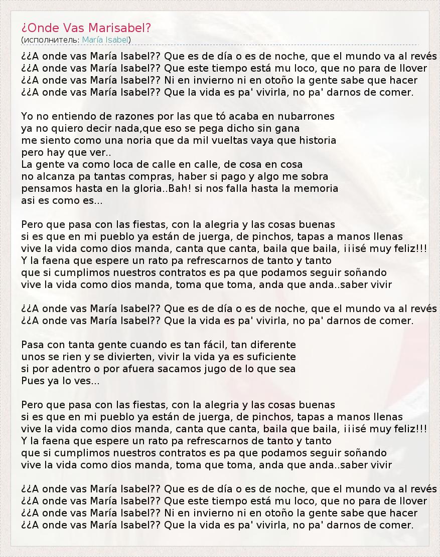 ¿¿A onde vas María Isabel?? Que la vida es pa' vivirla, no pa' darnos de comer.