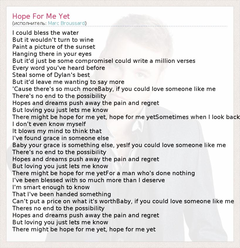 I could bless the water But it wouldn't turn to wine Paint a picture of the sunset Hanging there in your eyes But it'd just be some compromiseI could write a million verses Every word you've heard before Steal some of Dylan's best But it'd leave me wanting to say more 'Cause there's so much moreBaby, if you could love someone like me There's no end to the possibility Hopes and dreams push away the pain and regret But loving you just lets me know There might be hope for me yet, hope for me yetSometimes when I look back I don't even know myself It blows my mind to think that I've found grace in someone else Baby your grace is something else, yesIf you could love someone like me There's no end to the possibility Hopes and dreams push away the pain and regret But loving you just lets me know There might be hope for me yetFor a man who's done nothing I've been blessed with so much more than I deserve I'm smart enough to know That I've been handed something Can't put a price on what it's worthBaby, if you could love someone like me Theres no end to the possibility Hopes and dreams push away the pain and regret But loving you just lets me know There might be hope for me yet, hope for me yet