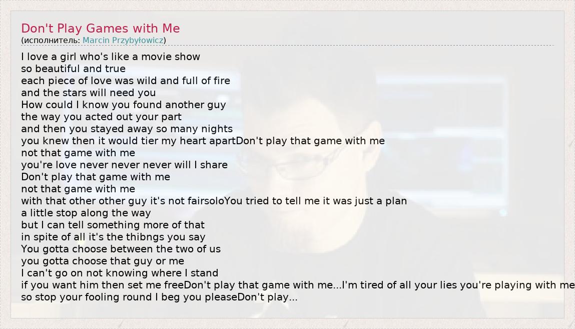 I love a girl who's like a movie show so beautiful and true each piece of love was wild and full of fire and the stars will need you How could I know you found another guy the way you acted out your part and then you stayed away so many nights you knew then it would tier my heart apartDon't play that game with me not that game with me you're love never never never will I share Don't play that game with me not that game with me with that other other guy it's not fairsoloYou tried to tell me it was just a plan a little stop along the way but I can tell something more of that in spite of all it's the thibngs you say You gotta choose between the two of us you gotta choose that guy or me I can't go on not knowing where I stand if you want him then set me freeDon't play that game with me...I'm tired of all your lies you're playing with me so stop your fooling round I beg you pleaseDon't play...
