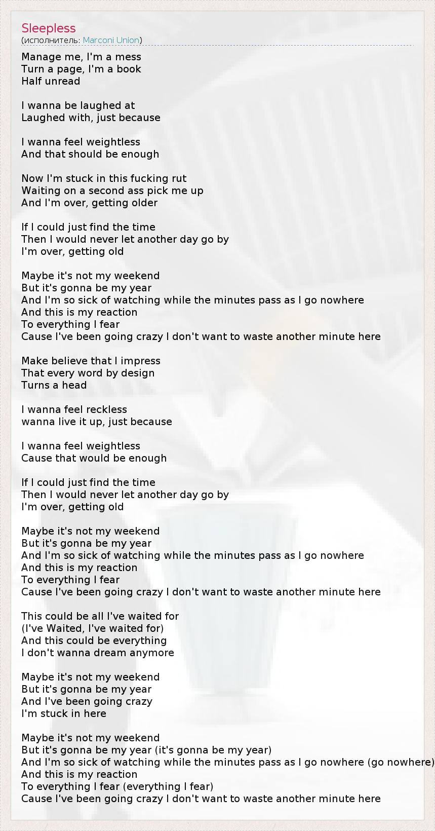 Управляй мной, я - беспорядок. Переверни страницу, я - книга, Прочитанная наполовину. Хочу чтобы надо мной смеялись, Хочу смеяться вместе с, просто потому что Хочу чувствовать себя невесомым - И этого должно быть достаточно. Теперь я застрял в этой долбаной колее, Ожидая, что какая-нибудь задница подберёт меня. И мне пришёл конец, я становлюсь старше. Если бы я только мог повернуть время вспять, Я бы не прожил ни одного бесцельного дня. Мне пришёл конец, я становлюсь старше. Может, это и не мой уикэнд, Но этот год будет моим. И я так устал наблюдать за тем, как время течёт, а я стою на месте. И это - мой ответ На всё, чего я боюсь, Потому что я схожу с ума, я больше не хочу ни минуты тратить впустую. Притворись, что я произвожу впечатление, Что каждое, произнесённое с умыслом, слово Кружит голову. Хочу чувствовать себя беззаботным, Хочу развлечься, просто потому что Хочу чувствовать себя невесомым - И этого должно быть достаточно. Если бы я только мог повернуть время вспять, Я бы не прожил ни одного дня бесцельно. Мне пришёл конец, я становлюсь старше. Может, это и не мой уикэнд, Но этот год будет моим. И я так устал наблюдать за тем, как время течёт, а я стою на месте. И это - мой ответ На всё, чего я боюсь, Потому что я схожу с ума, я больше не хочу ни минуты тратить впустую. Это могло быть всем, чего я ждал (Я ждал, я ждал), И всем, О чём я больше не хочу мечтать. Может, это и не мой уикэнд, Но этот год будет моим. Я схожу с ума И застреваю здесь. Может, это и не мой уикэнд, Но этот год будет моим (этот год будет моим). И я так устал наблюдать за тем, как время течёт, а я стою на месте (стою на месте). И это – мой ответ На всё, чего я боюсь (всё, чего я боюсь), Потому что я схожу с ума, я больше не хочу ни минуты тратить впустую.