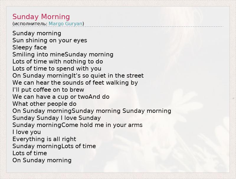 Sunday morning Sun shining on your eyes Sleepy face Smiling into mineSunday morning Lots of time with nothing to do Lots of time to spend with you On Sunday morningIt's so quiet in the street We can hear the sounds of feet walking by I'll put coffee on to brew We can have a cup or twoAnd do What other people do On Sunday morningSunday morning Sunday morning Sunday Sunday I love Sunday Sunday morningCome hold me in your arms I love you Everything is all right Sunday morningLots of time Lots of time On Sunday morning