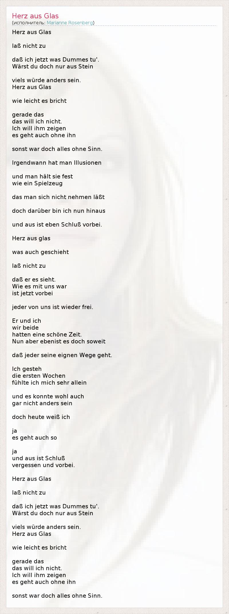 Herz aus Glas laß nicht zu daß ich jetzt was Dummes tu'. Wärst du doch nur aus Stein viels würde anders sein. Herz aus Glas wie leicht es bricht gerade das das will ich nicht. Ich will ihm zeigen es geht auch ohne ihn sonst war doch alles ohne Sinn. Irgendwann hat man Illusionen und man hält sie fest wie ein Spielzeug das man sich nicht nehmen läßt doch darüber bin ich nun hinaus und aus ist eben Schluß vorbei. Herz aus glas was auch geschieht laß nicht zu daß er es sieht. Wie es mit uns war ist jetzt vorbei jeder von uns ist wieder frei. Er und ich wir beide hatten eine schöne Zeit. Nun aber ebenist es doch soweit daß jeder seine eignen Wege geht. Ich gesteh die ersten Wochen fühlte ich mich sehr allein und es konnte wohl auch gar nicht anders sein doch heute weiß ich ja es geht auch so ja und aus ist Schluß vergessen und vorbei. Herz aus Glas laß nicht zu daß ich jetzt was Dummes tu'. Wärst du doch nur aus Stein viels würde anders sein. Herz aus Glas wie leicht es bricht gerade das das will ich nicht. Ich will ihm zeigen es geht auch ohne ihn sonst war doch alles ohne Sinn.